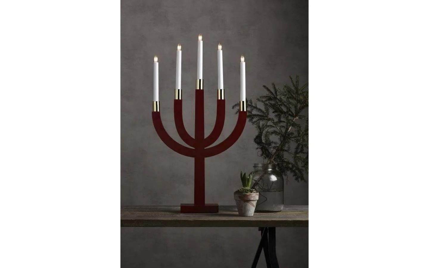 Fina Elias adventsljusstake, från Star Trading, är en ståtlig 5-armad ljusstake. Gjord i trä med en röd finish och vackra mässingshylsor runt ljusen blir detta en stilfull inredningsdetalj i ditt hem till jul.