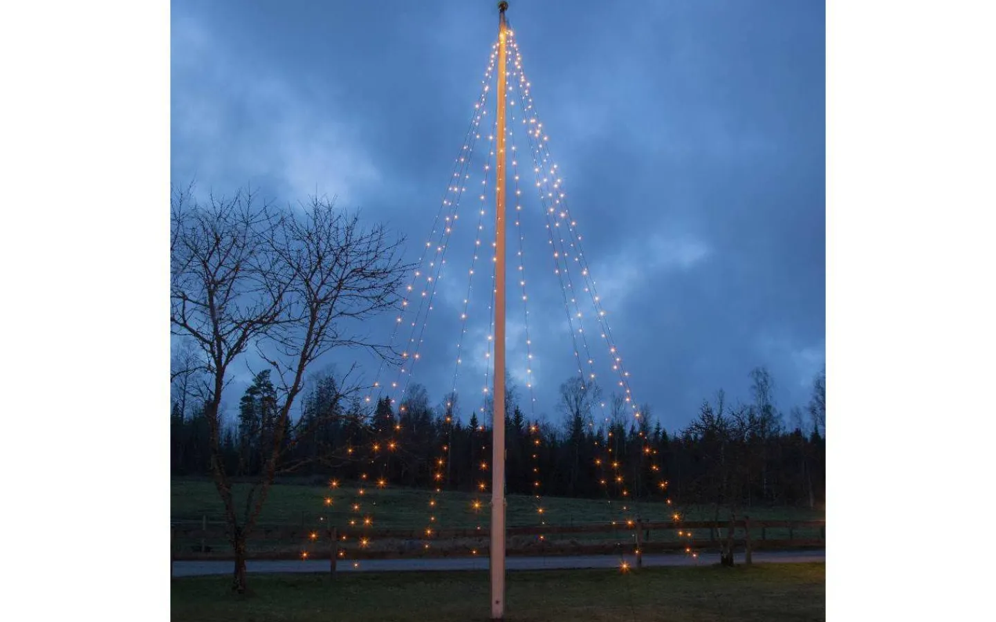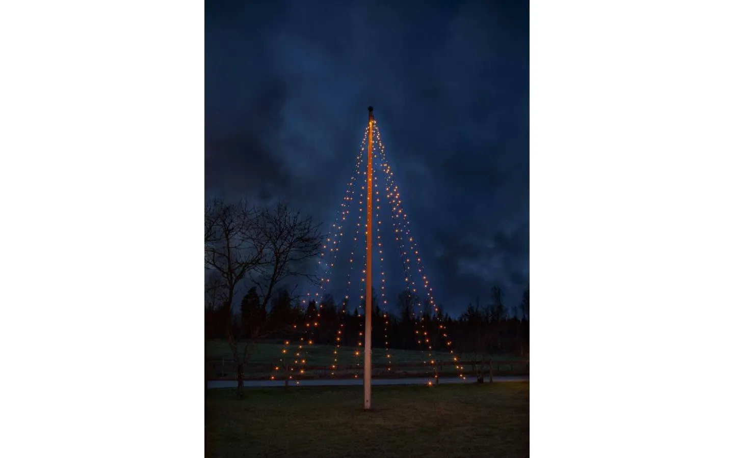Svart flaggstångsbelysning med 360 LED-ljuskällor med varmvitt sken fördelade på 10 slingor. Passar perfekt till dig som vill lysa upp din trädgård under jul. Ljusslingan är 7 meter lång och har 10 meter långa nylonsnören för fastsättning i marken.