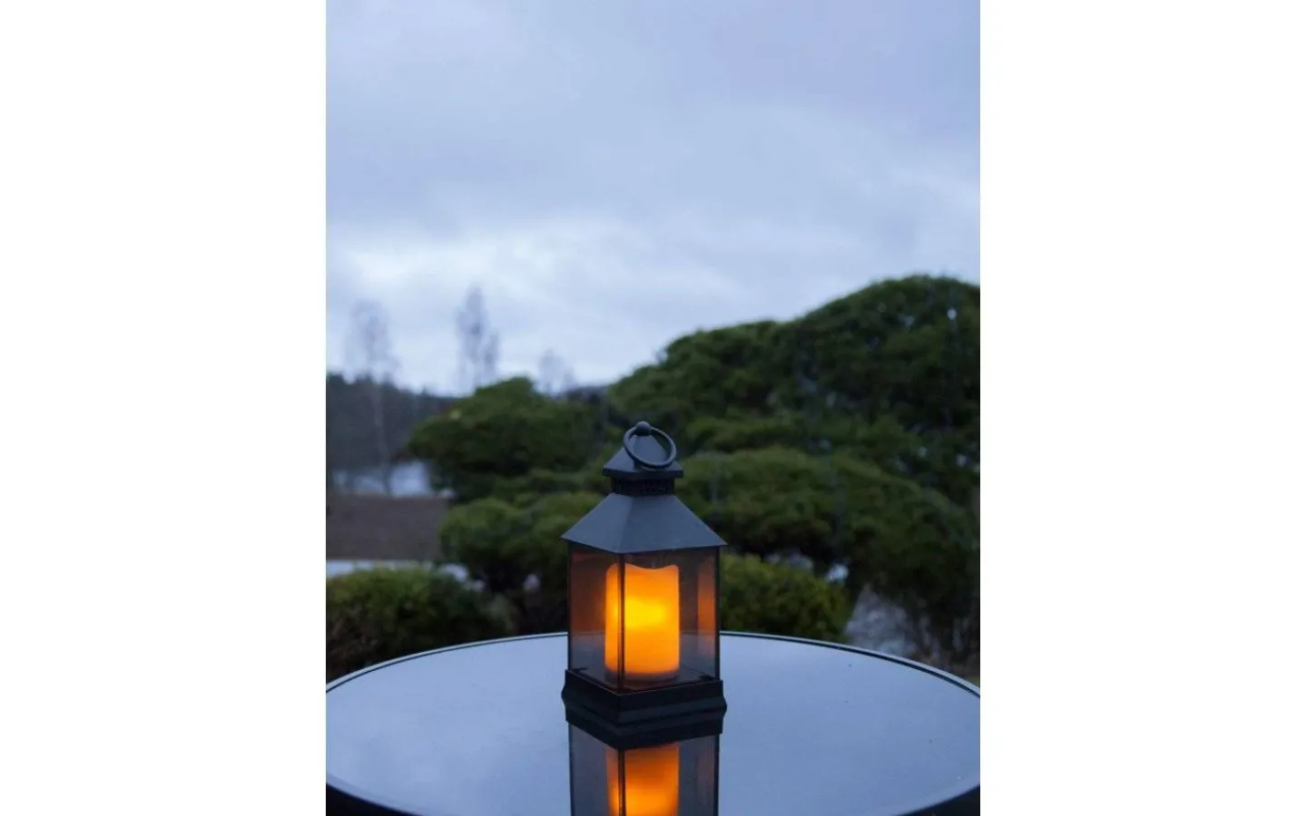 En fin, svart ljuslykta med inbyggt blockljus som avger ett flammande, verklighetstroget ljussken. Lyktan kan användas både inomhus som utomhus.