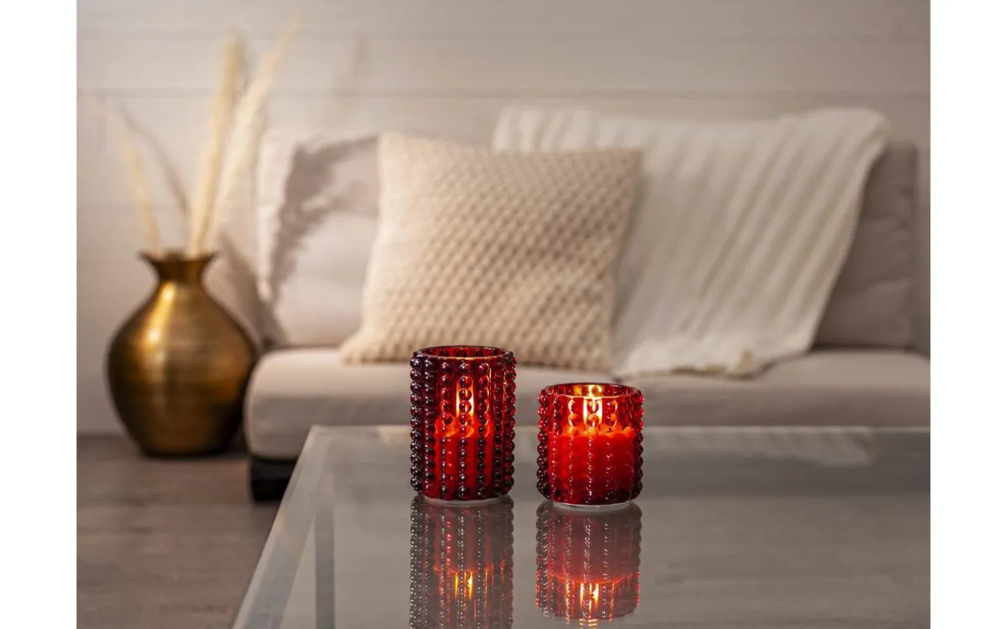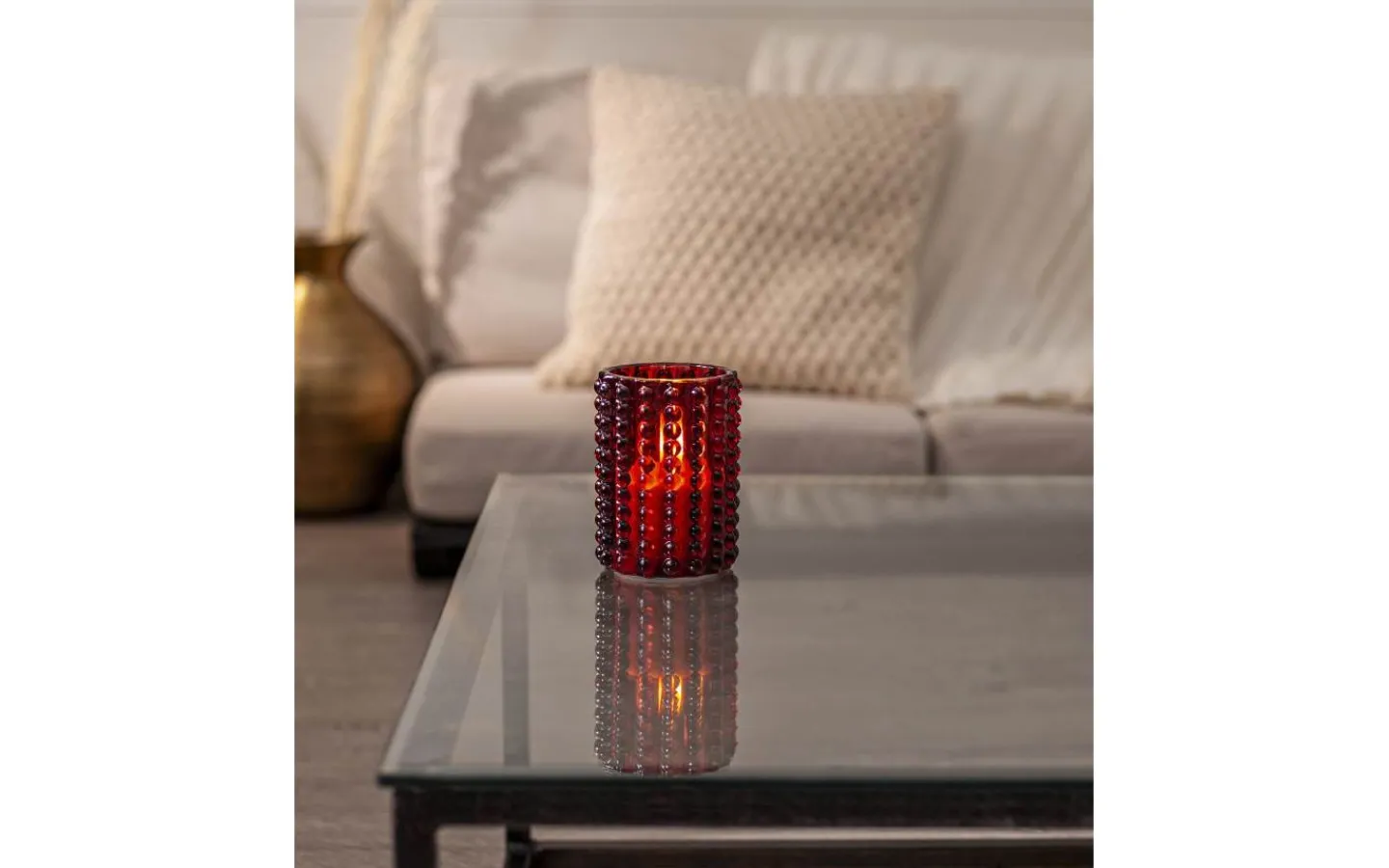 Flamme Dotty ljuslykta från Star Trading har ett rött glashölje med prickmönster runt vaxljuset. Detta ljus blir en vacker dekoration, både ensam som i grupp ihop med övriga ljus från vår Flamme serie.