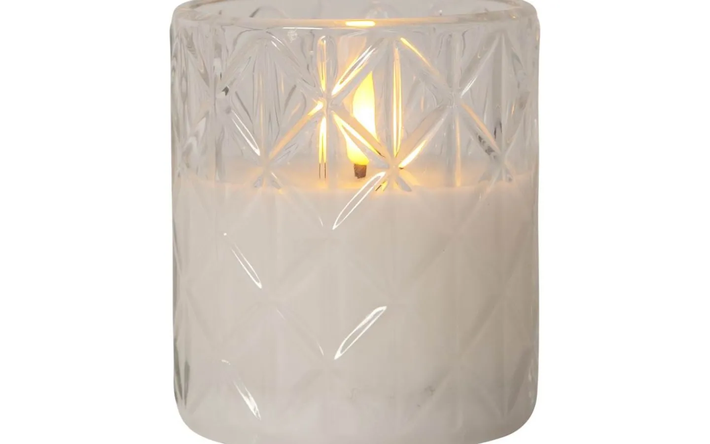 Flamme Romb från Star Trading har ett klart glashölje med rombformat mönster runt vaxljuset. Den naturtrogna runda 3D lågan är placerad på en svart veke och lyser i ett härligt varmvitt sken. Ljuslågan skiftar i ljusstyrka för att avge ett extra verklighetstroget intryck.