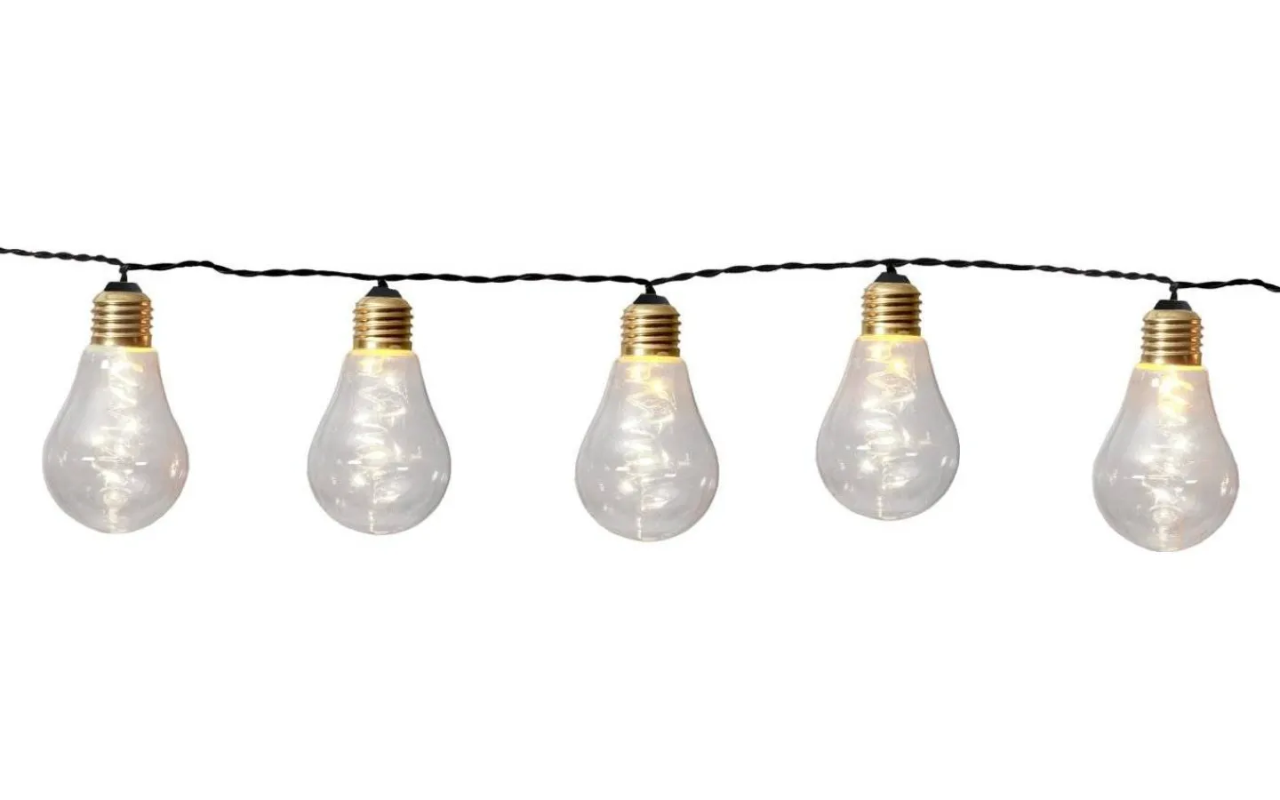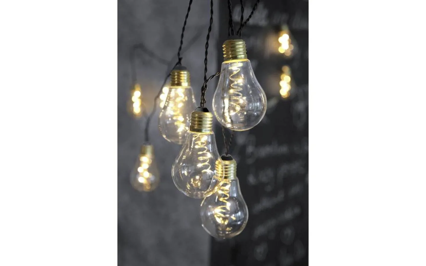 Glow är en väldigt dekorativ ljusslinga i LED med 10st ljuskällor i LED. Den vackra ljustråden har ett glashölje format som en klassisk, gammal glödlampa med mässingsfärgad topp.