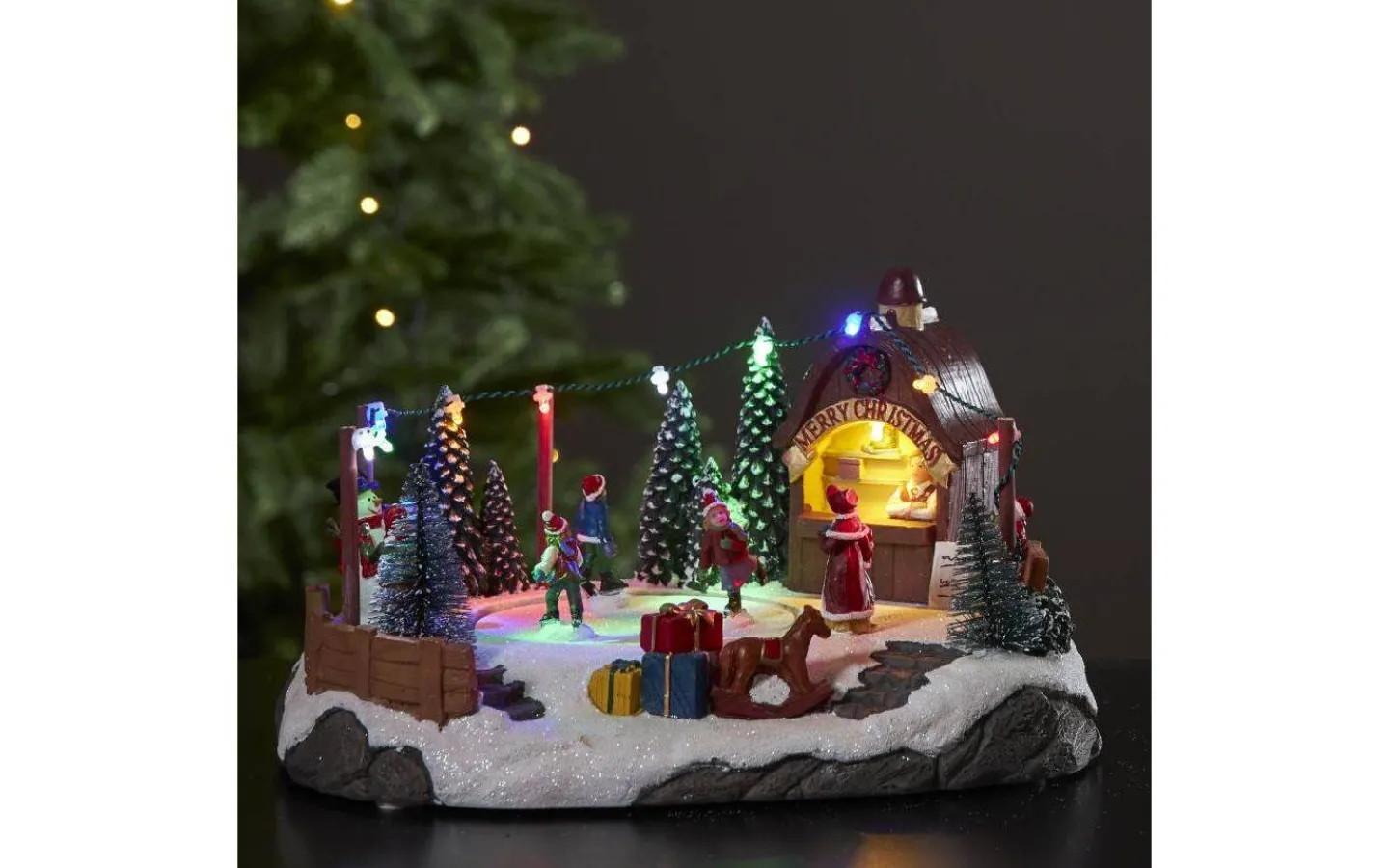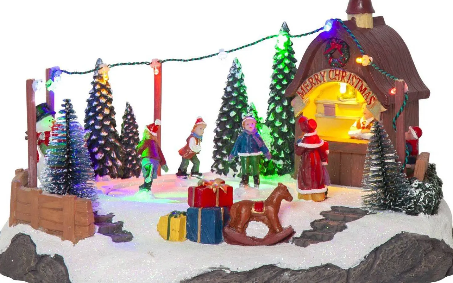 Iceville är ett dekorativt vinterlandskap med roterande skridskobana, skidåkare och vackert upplyst skjul. Dekorera till advent och jul och få en härlig julkänsla som passar både barnrummet och på en hylla eller skänk.