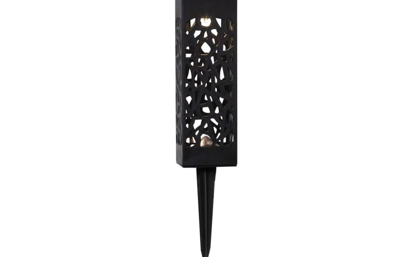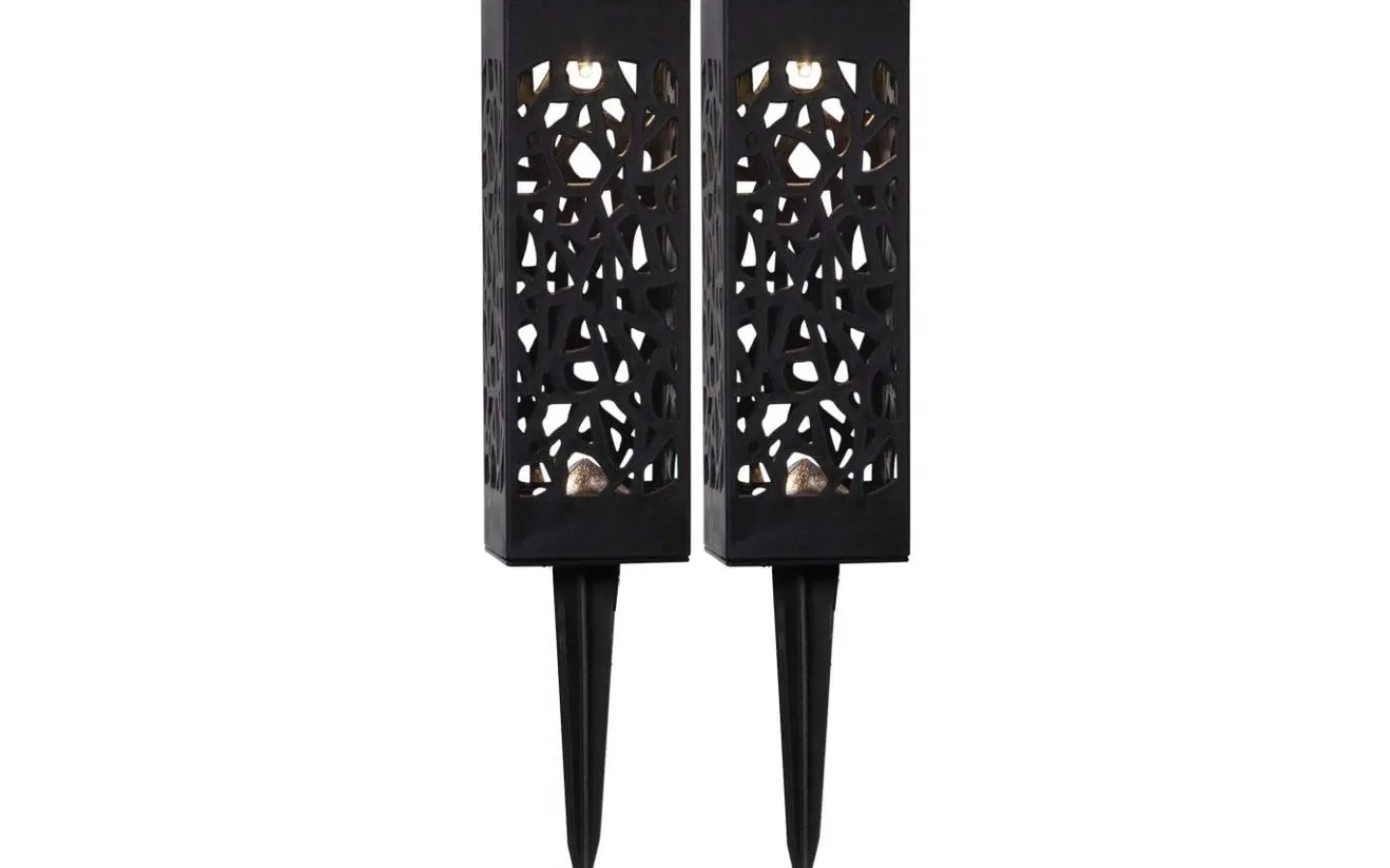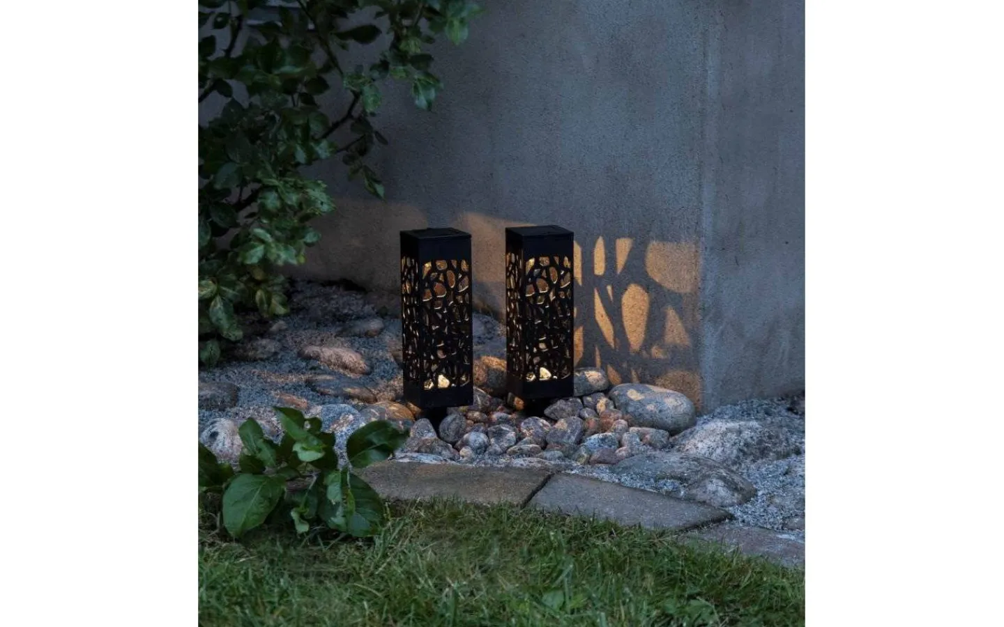 2-pack solcellsdrivna gångljus i svart plast. Det utskurna mönstret ger en vacker ljuseffekt på marken.