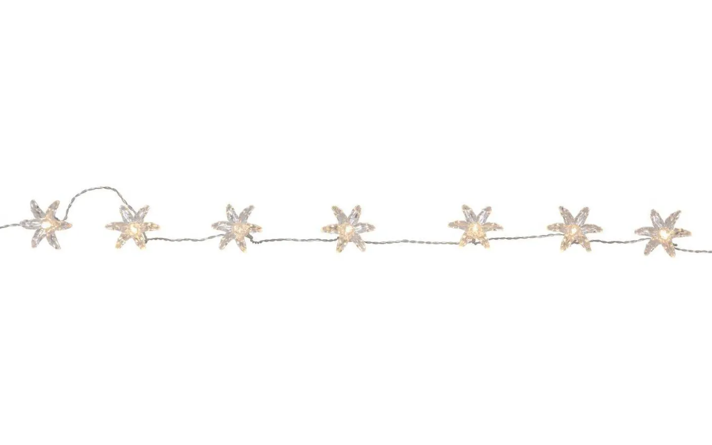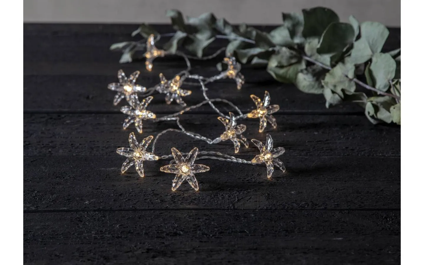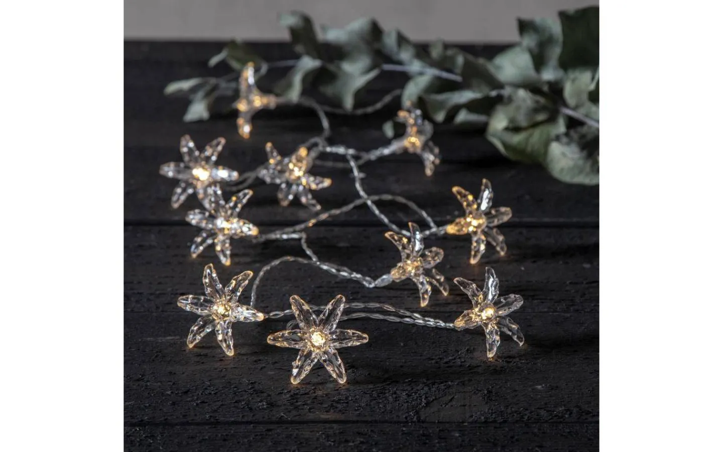 Batteridriven ljusslinga med transparenta dekorationer i form av blommor. Dekorativ inredning som ger ett mysigt sken.