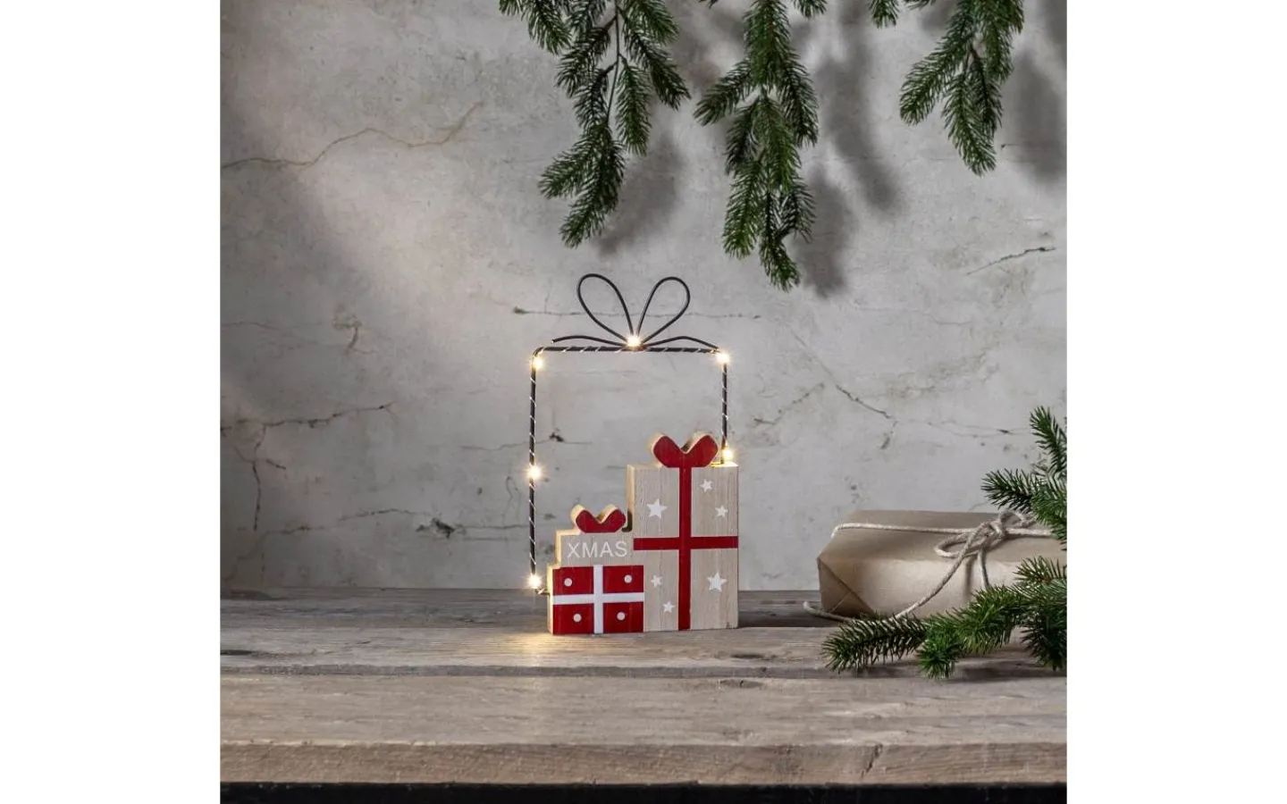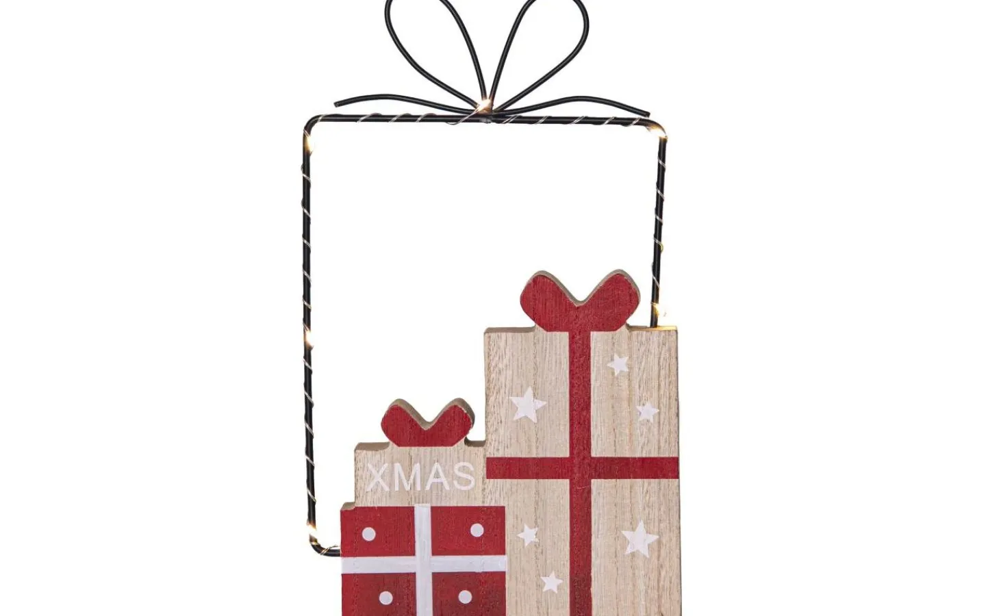 En stämningsfull juldekoration i form av en siluett av en julklapp i metall, kompletterad med vackert målade paket i trä. De små virade LED-ljusen sprider ett mjukt sken som framhäver paketets form och skapar en mysig atmosfär.