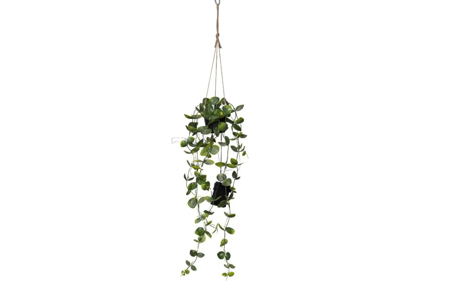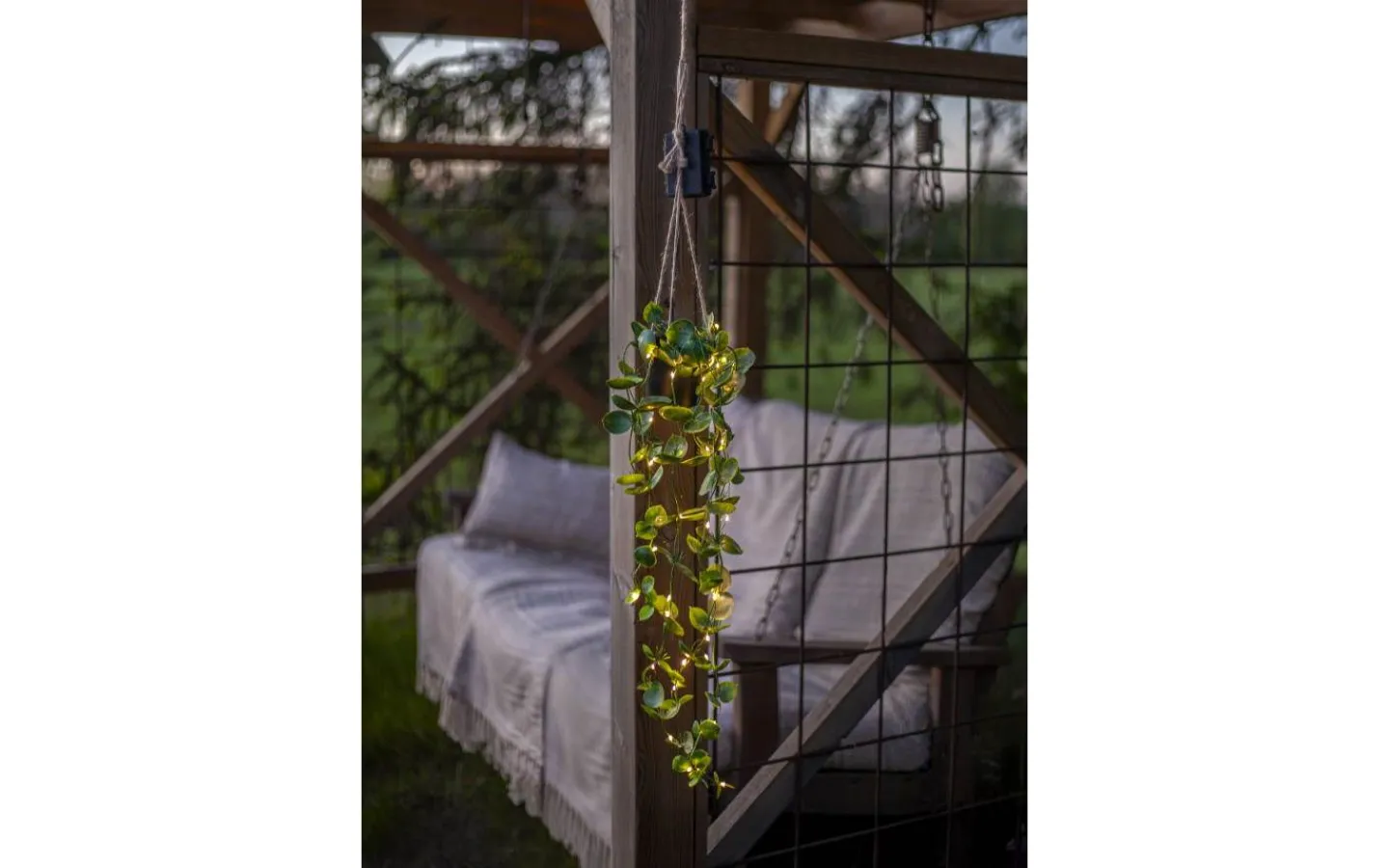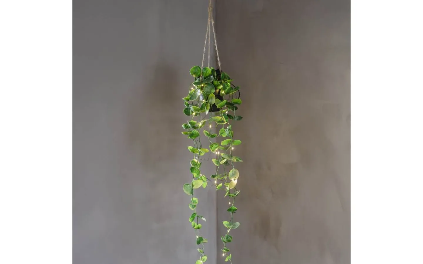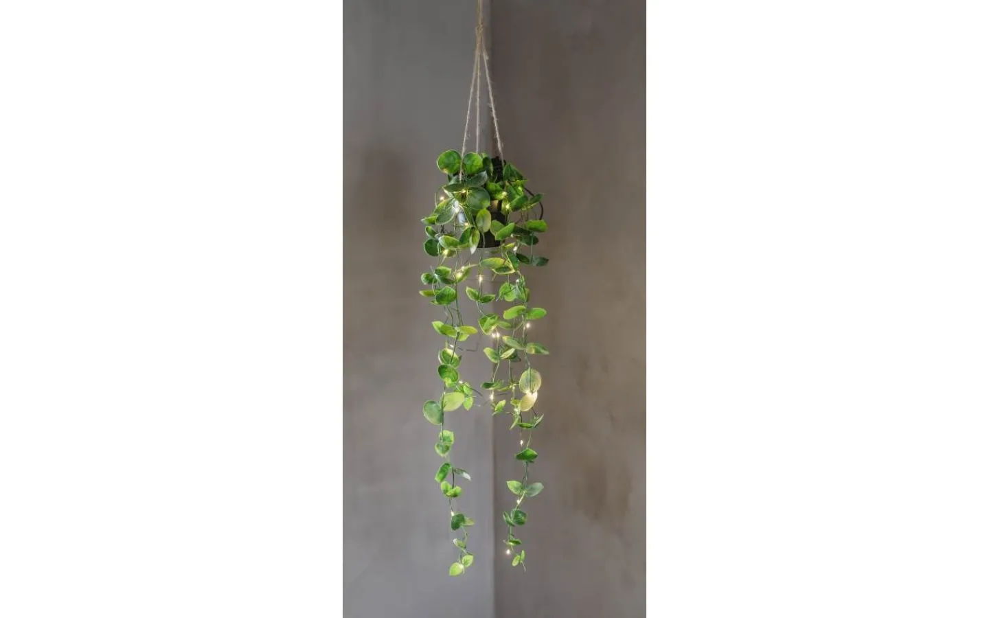 Dekorativ konstväxt med dew drop slinga, 35 varmvita ljuspunkter ger ett fint sken. Perfekt grönska för hemmets lite mörkare vrår, passar även utomhus då batteridosan är tillämpad för utebruk. Svart plastkruka med juterep för enkel placering, hängande eller stående. 3 batterier AA ingår ej. Batteritid ca. 80h.