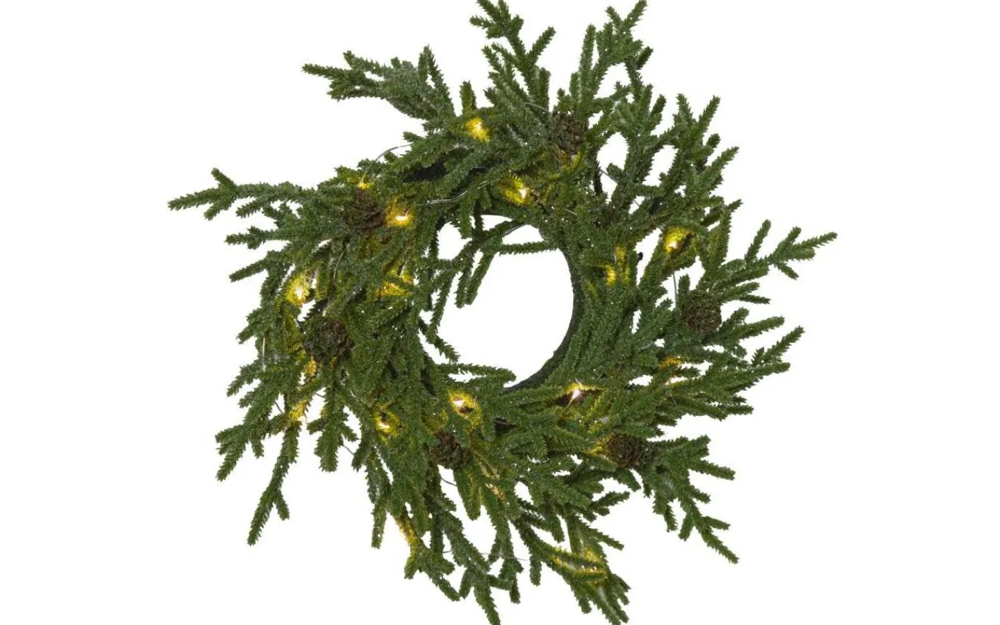 Fin julkrans att dekorera med inomhus, från välkända varumärket Star Trading. Denna krans är gjord i verklighetstroget, grönt PE-material och har små, fina kottar och lite glitter för extra härlig julkänsla! Kransen är bestyckad med en tunn ljusslinga i silverfärgad metall som har totalt 20 stycken små, fina LED-lampor. Lamporna avger ett mysigt, varmvitt ljussken.