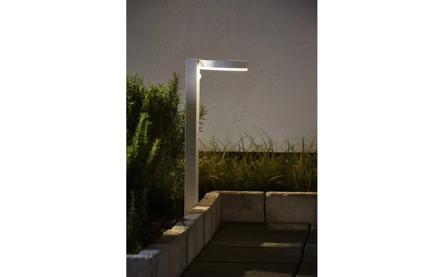 Solcellsdriven gångbelysning som under natten och via rörelseindikation lyser upp med 500 Lumen i 25 sekunder och går sedan ner till 70 Lumen konstant ljus.