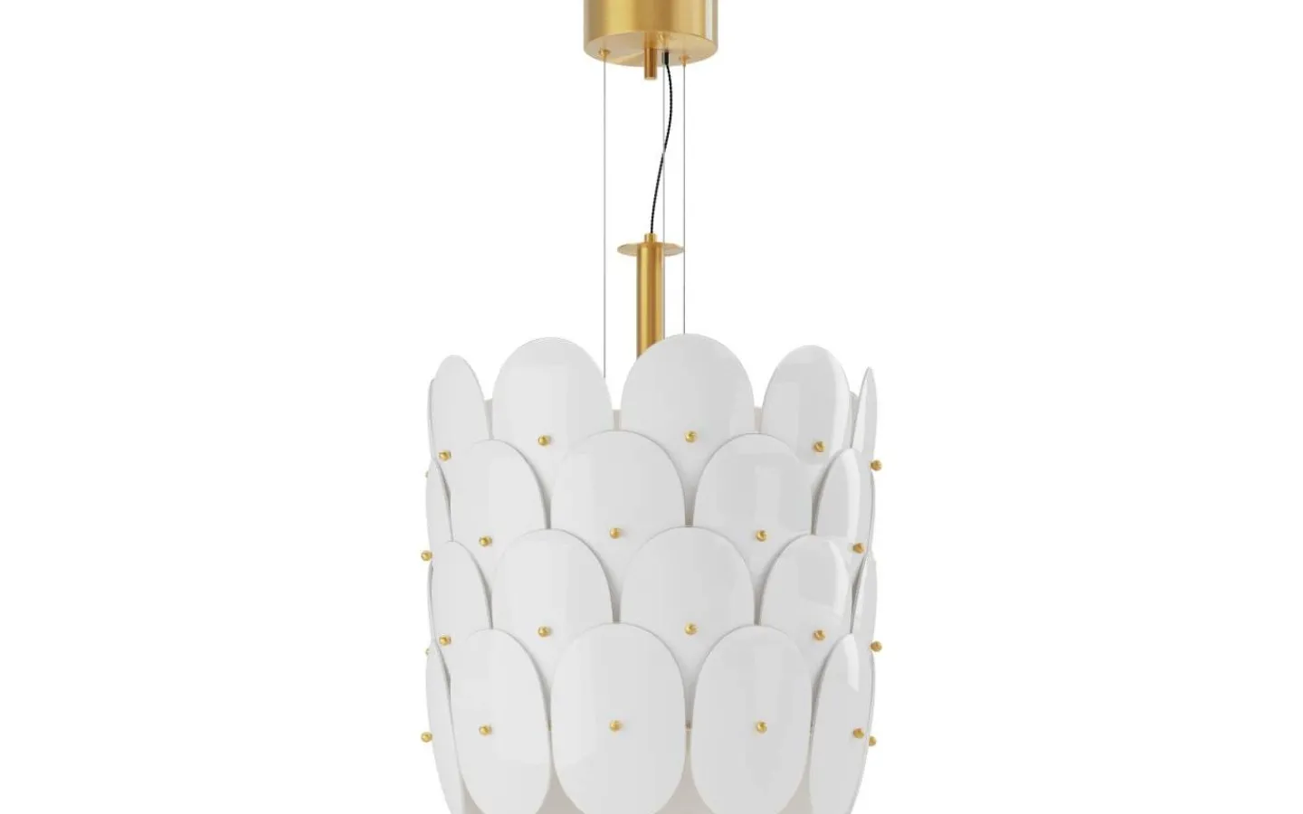 Omlott taklampa från välkända By Rydens är designad av den Mia Lagerman som här skapat en exklusiv och dekorativ lampa som verkligen sticker ut med sin unika form och uttryck. Den runda, eleganta designen i blankt vitt glas skapar ett mjukt och behagligt ljus och de vackra knopparna i mässing ger lampan en sofistikerad och stilren känsla. Ljuskälla köpes separat, se passande förslag under tillbehör.