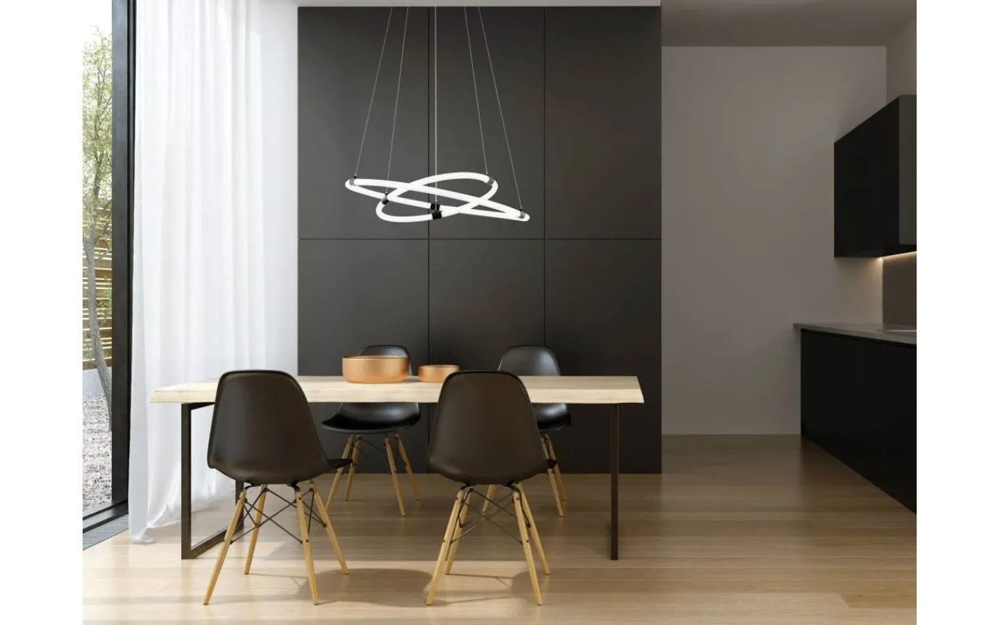 BANDERILLAS LED-pendellampa har två runda LED-profiler av vit plast och ett takfäste i svart metall. Lysdioderna är upphängda på justerbara linjer och kan arrangeras om för att anpassa ljusets utseende. De integrerade lysdioderna ger ett behagligt varmvitt ljus och ger 360° belysning för utrymmet. Med sin ovanliga, lekfulla design smälter taklampan sömlöst med minimalistiska och moderna interiörer och ger en distinkt belysningslösning för alla utrymmen, oavsett om det är i vardagsrummet eller ovanför bordet i matsalen.