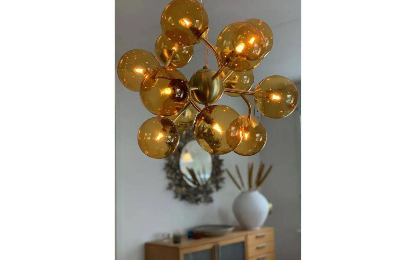 Como taklampa från Oriva har 12st amberfärgade glaskupor som skapar ett glamoröst och modernt uttryck.