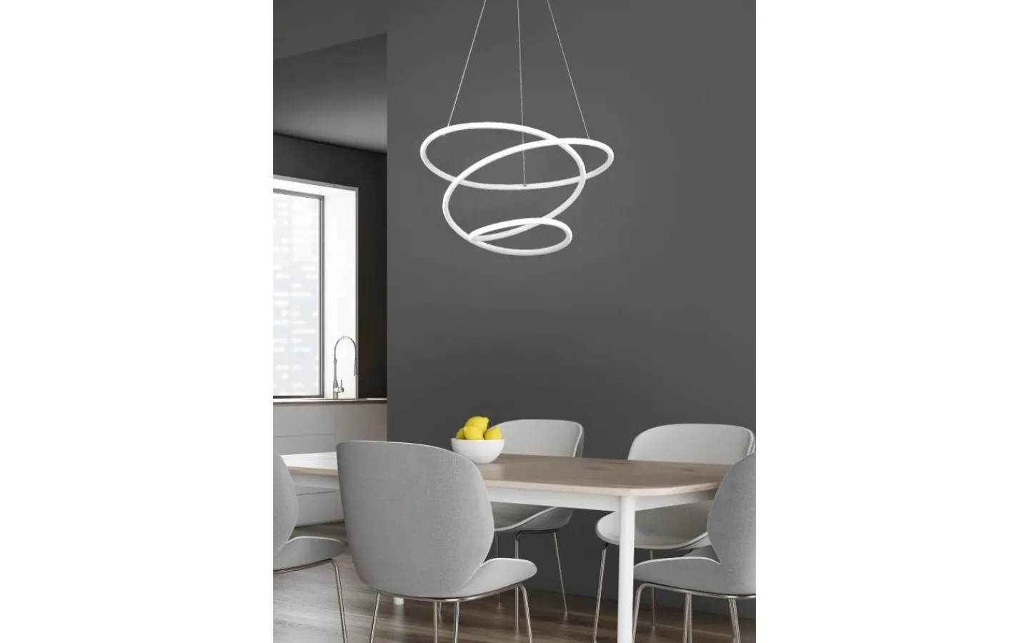 Tack vare sin ovanliga form har den djärva pendellampan BOLOGNA en dekorativ effekt på omgivningen och sätter eleganta accenter i ditt vardagsrum och matsal. Med sin moderna design och perfekta placering är lampan ett blickfång i ditt hem. Dessutom kan ljusstyrkan justeras i 3 steg med den vanliga ljusströmbrytaren och anpassas till olika behov. I mattvitt avrundar armaturen moderna boendekoncept perfekt. Dessutom har armaturerna modern LED-teknik, vilket står för hög ljuskvalitet. LED-ljuskällor kännetecknas av lång livslängd och låg värmeutveckling. Ljuskälla: inklusive 1x SMD LED, 36W · 1x 5100lm, 4000K. Extra information: 4000K, IP20, Ej lämplig för extern dimmer, Dimbar via strömbrytare