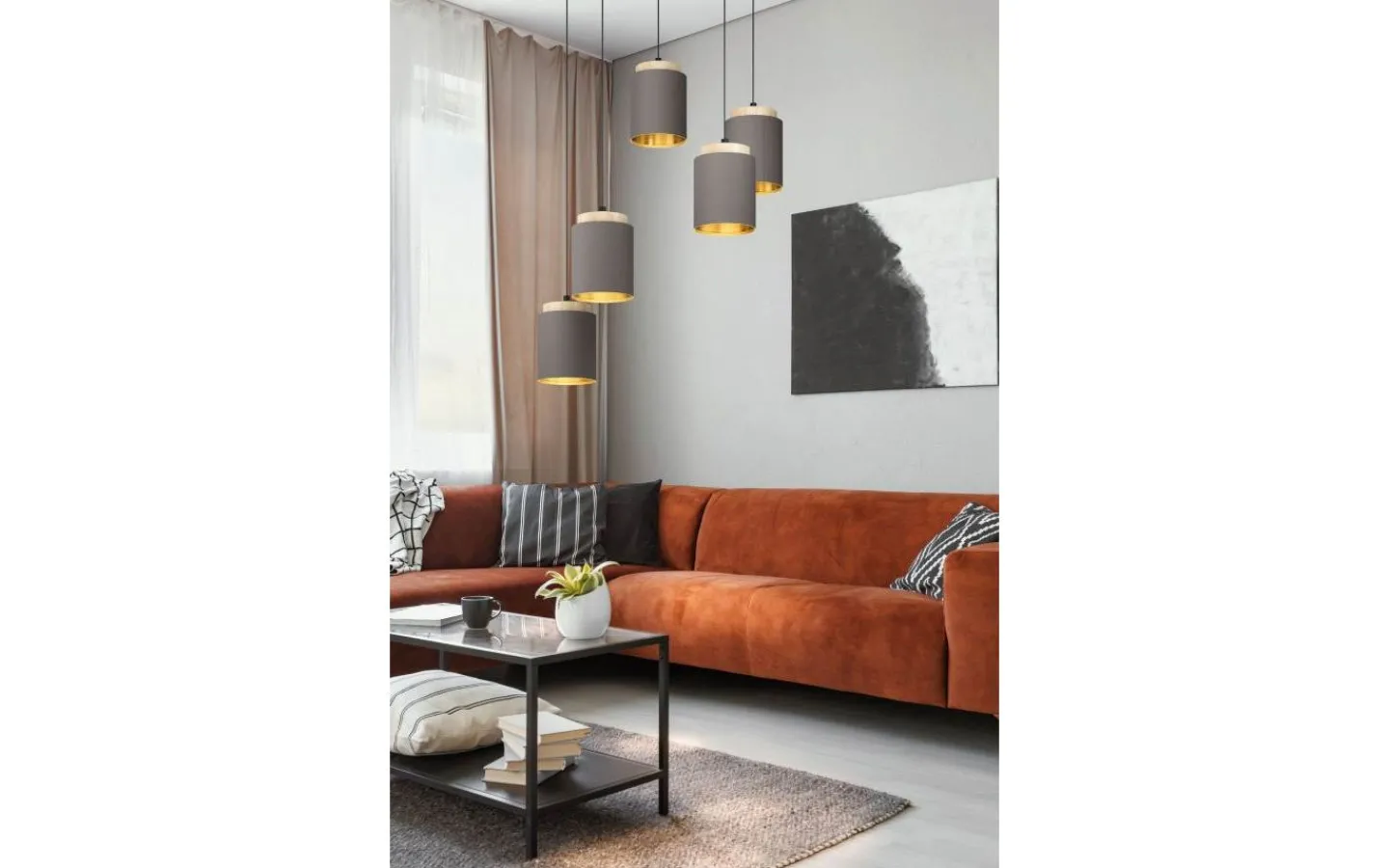 ALBARIZA taklampa har fem cylindriska tyglampskärmar i cappuccino med en guldfärgad inre finish. Tillsammans med takfästet i svart metall skapar de naturliga träelementen överst på lamporna en hemtrevlig tilltalande. Den hängande lampan är ett härligt tillskott till alla moderna interiörer och pendlarnas spiralarrangemang skapar ett verkligt inslag i vardagsrummet eller ovanför bordet i matsalen.