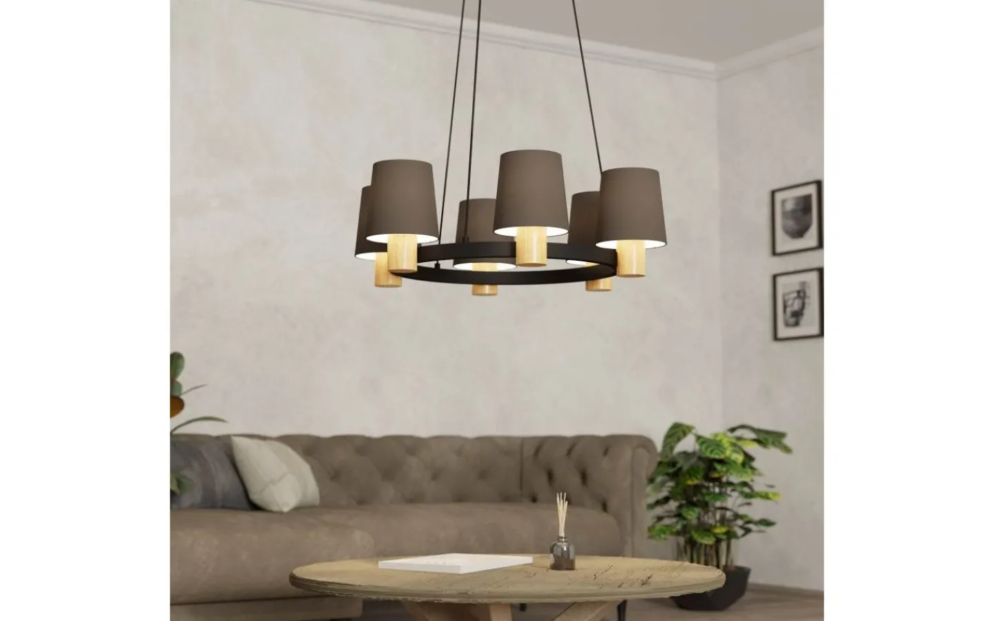 Edale taklampa är en uttrycksfull ljusarmatur som kombinerar strama svarta linjer med naturliga träelement, vilket skapar en unik och iögonfallande belysning. Armaturen är 70 cm lång och består av en solid svart ram som håller sex cylindriska skärmar i svart tyg, vilket ger en jämn och behaglig ljusspridning. De varma träaccenterna i botten av varje skärm bryter av den svarta färgen och tillför en mjukhet och värme till designen. Denna mångsidiga taklampa är perfekt för en mängd olika interiörer, från moderna till mer rustika miljöer och skulle passa väl i allt från vardagsrum och sovrum till matsalar där den kan tjäna som ett elegant centrum. Edale taklampans design är både tidlös och modern, och ger ett snyggt, men ändå hemtrevligt uttryck.