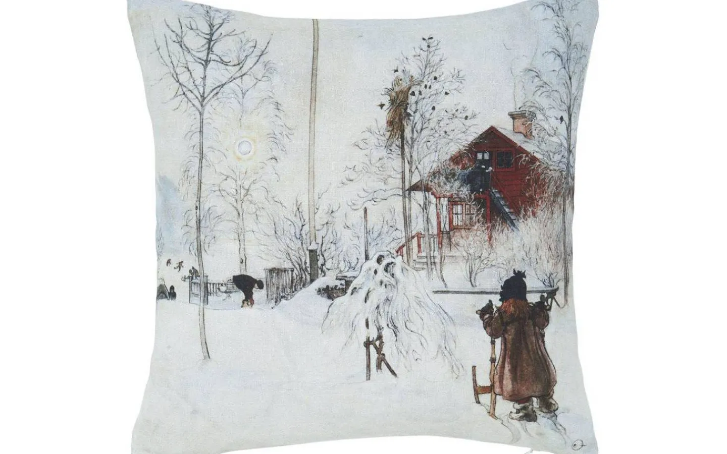 War välkommen kära du, till Carl Larsson och hans fru! Gården är ett kuddfodral i 100% linnetyg med dold dragkedja i nederkantkant. Mått 45x45cm. Innerkudde köpes separat. För ett välfyllt utseende använd gärna en innerkudde som är något större, ca 50x50cm. År 1897, fyraåringen Brita är ute och åker spark. Bakom ser vi det nybyggda brygghuset där de båda jungfrurna sov sommar som vinter. Produkten är certifierad enligt STANDARD 100 by OEKO-TEX®. Certifieringen garanterar att produkten är testad och fri från ämnen som kan vara skadliga för hälsan och miljön. 40 grader skontvätt Klorblekmedel får ej användas Tål strykning med hög temperatur Kemtvätt (Perkloretylen) Kan ej torktumlas.