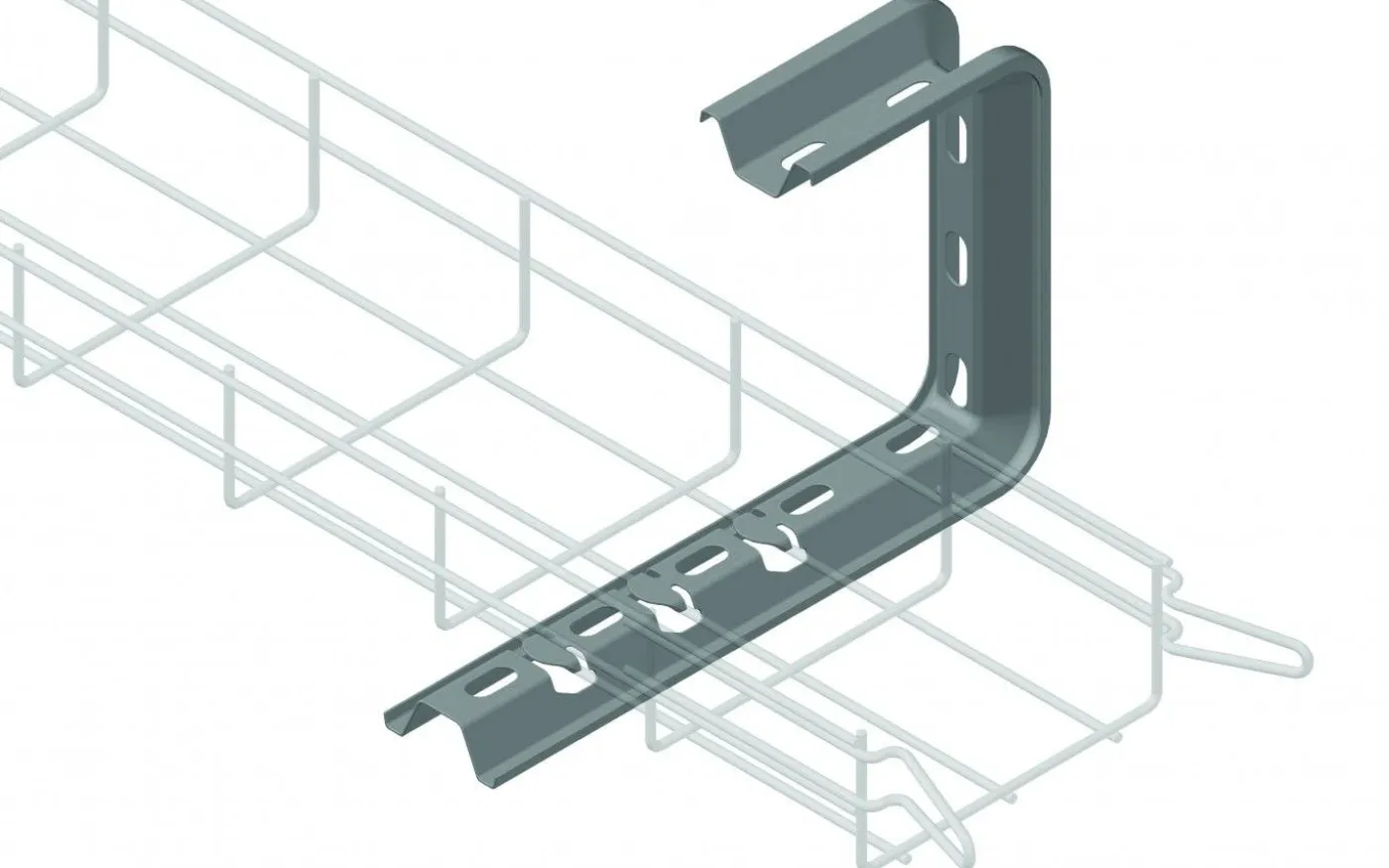 Takkonsol för varmgalvaniserade trådstegar. Trådstegen låses mot konsolen med klämmor som böjs ned. Kan kompletteras med ändskydd E11 337 90.