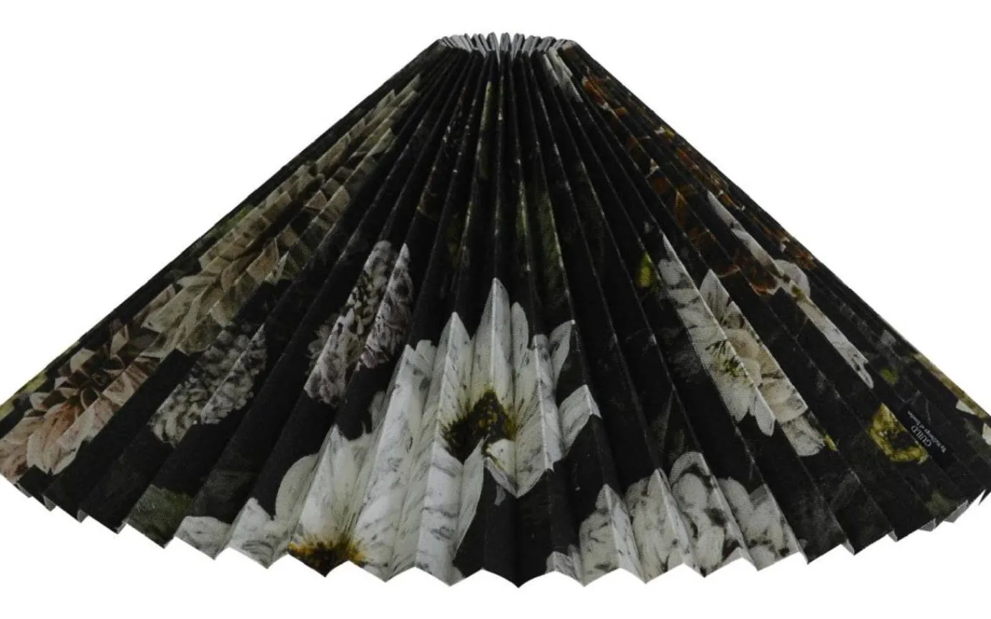 Dahlia Noir takskärm från välkända Hallbergs Lighting of Sweden är en vackert plisserad, takskärm med motiv av dahlior.
