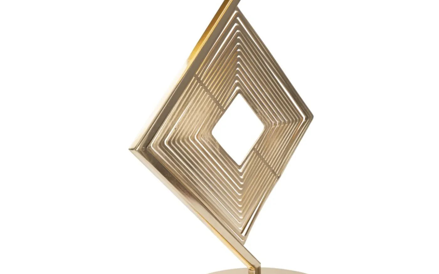 Bordslampa i gyllene metall med elegant geometrisk dekoration komplett med lampskärm i vit tyg med guldkant.