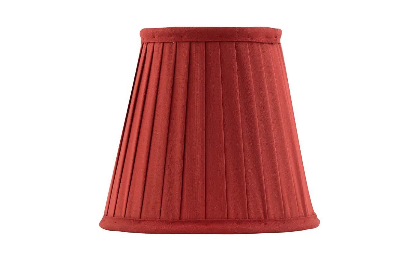 Klassisk textilskärm i veckat bomullstyg med en klämfattning för E14-lampor. Röd bomulstextil 12×14 cm Klämfattning