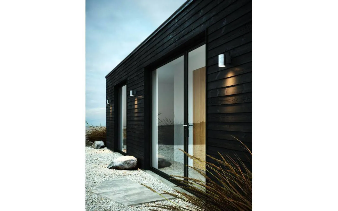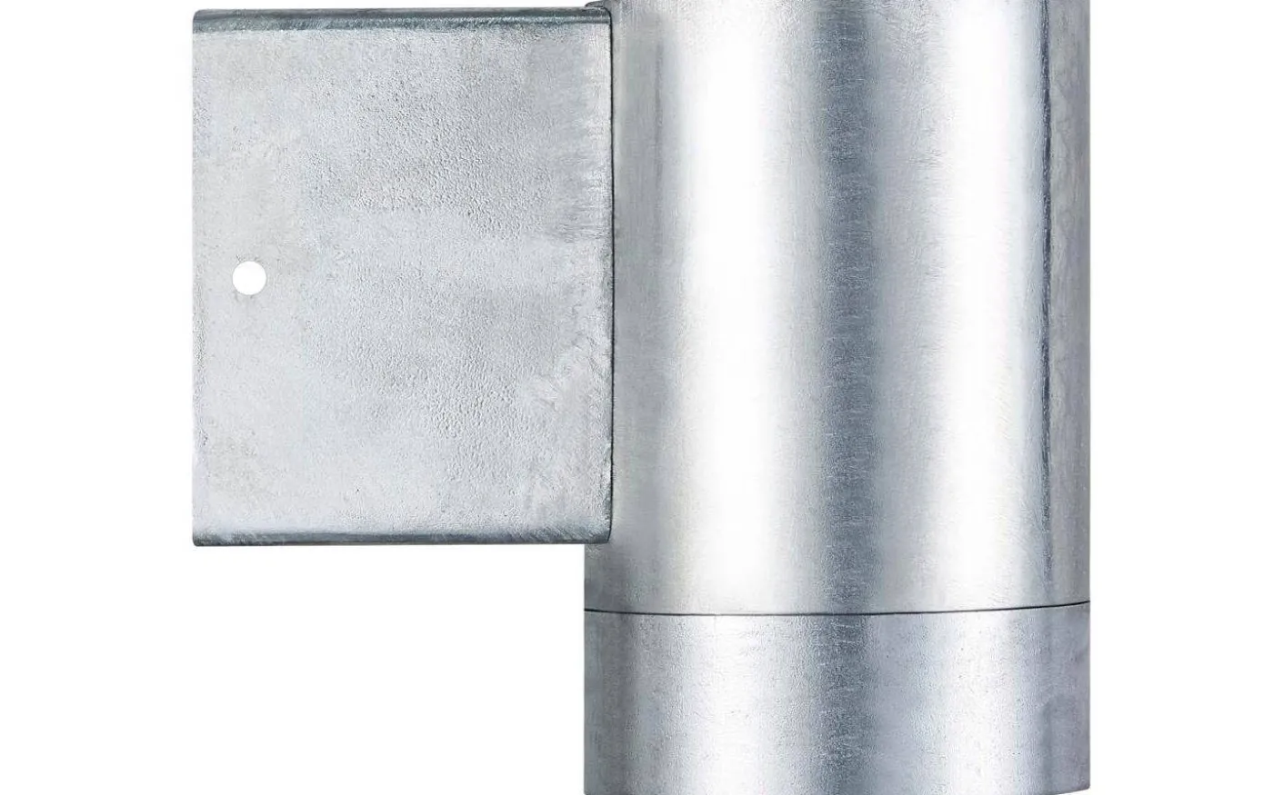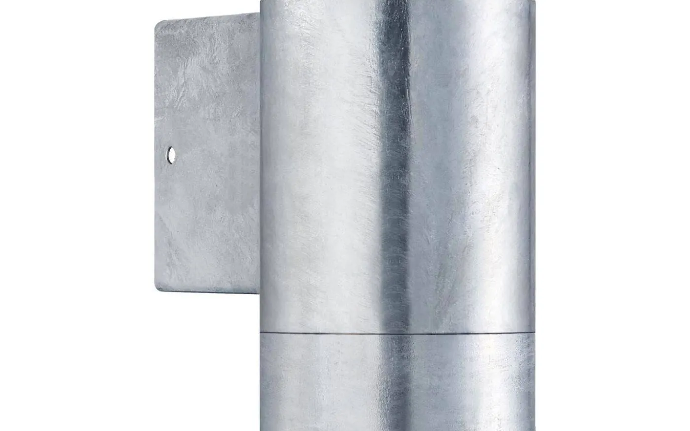 Tin vägglampa, från danska Nordlux, är tillverkad i galvaniserat stål och avger en indirekt ljuseffekt nedåt mot väggen.