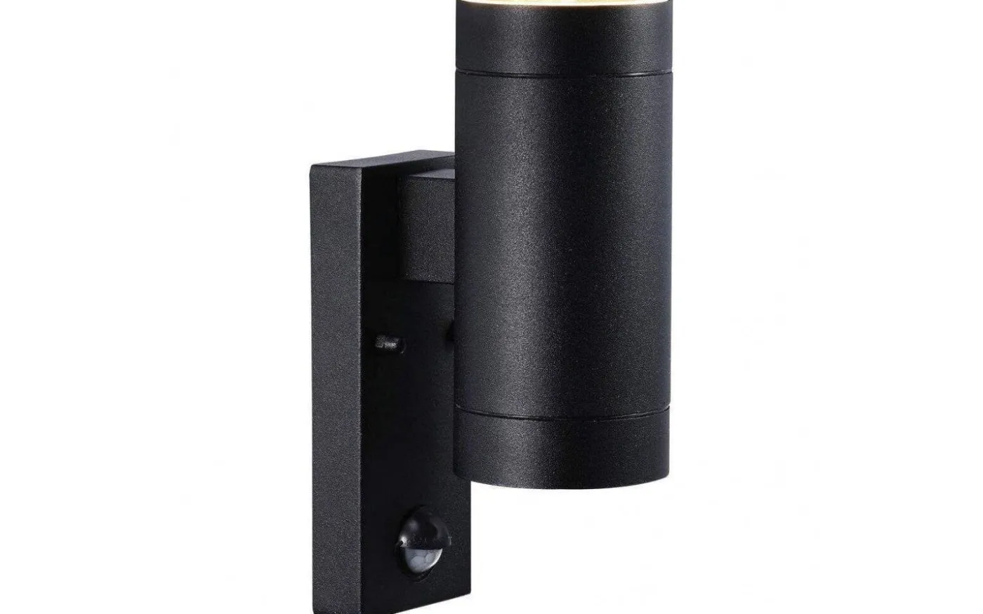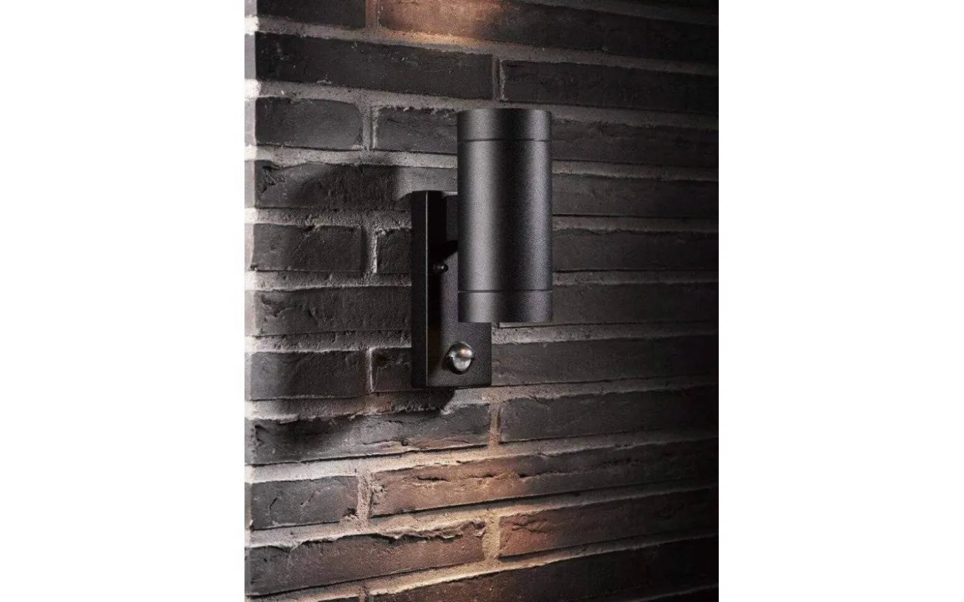 Tin vägglampa, från danska Nordlux, har inbyggd rörelsesensor och avger ljussken uppåt och nedåt. En perfekt vägglampa att placera längs en mur, vid uppfarten eller på fasaden vid ytterdörren.