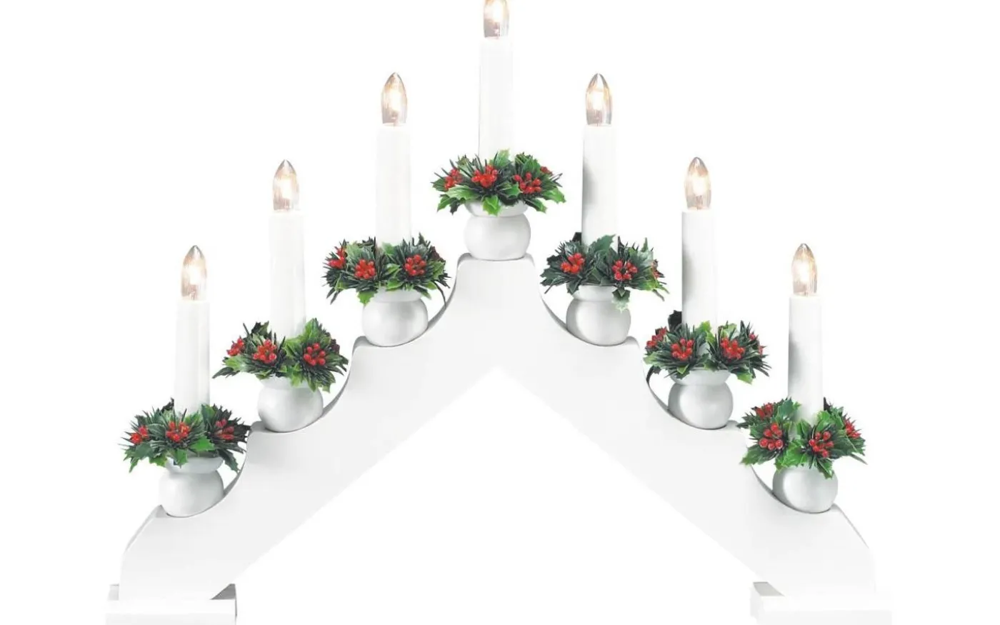 Sjuarmad ljusstake i vitmålat trä. Ljusmanschett av plast i grönt och rött. En riktig klassiker i vit tappning. Tekniskt: Lampan kräver sju glödlampor med E10-sockel om max 3W, ingår. 2 m lång sladd med strömbrytare.