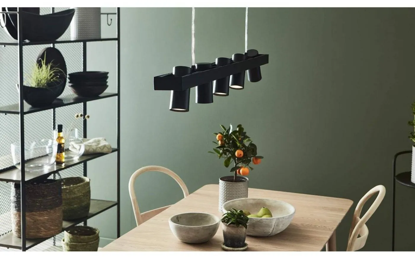 Torino taklampa, från välkända Markslöjd, är en takpendel i avlång modell av svartackerad metall. Denna taklampa har fem vinklingsbara spotlights innanför den rektangulära metallramen och blir en modern och stilren taklampa över ett avlångt matbord eller över en öppen arbetsyta i köket.