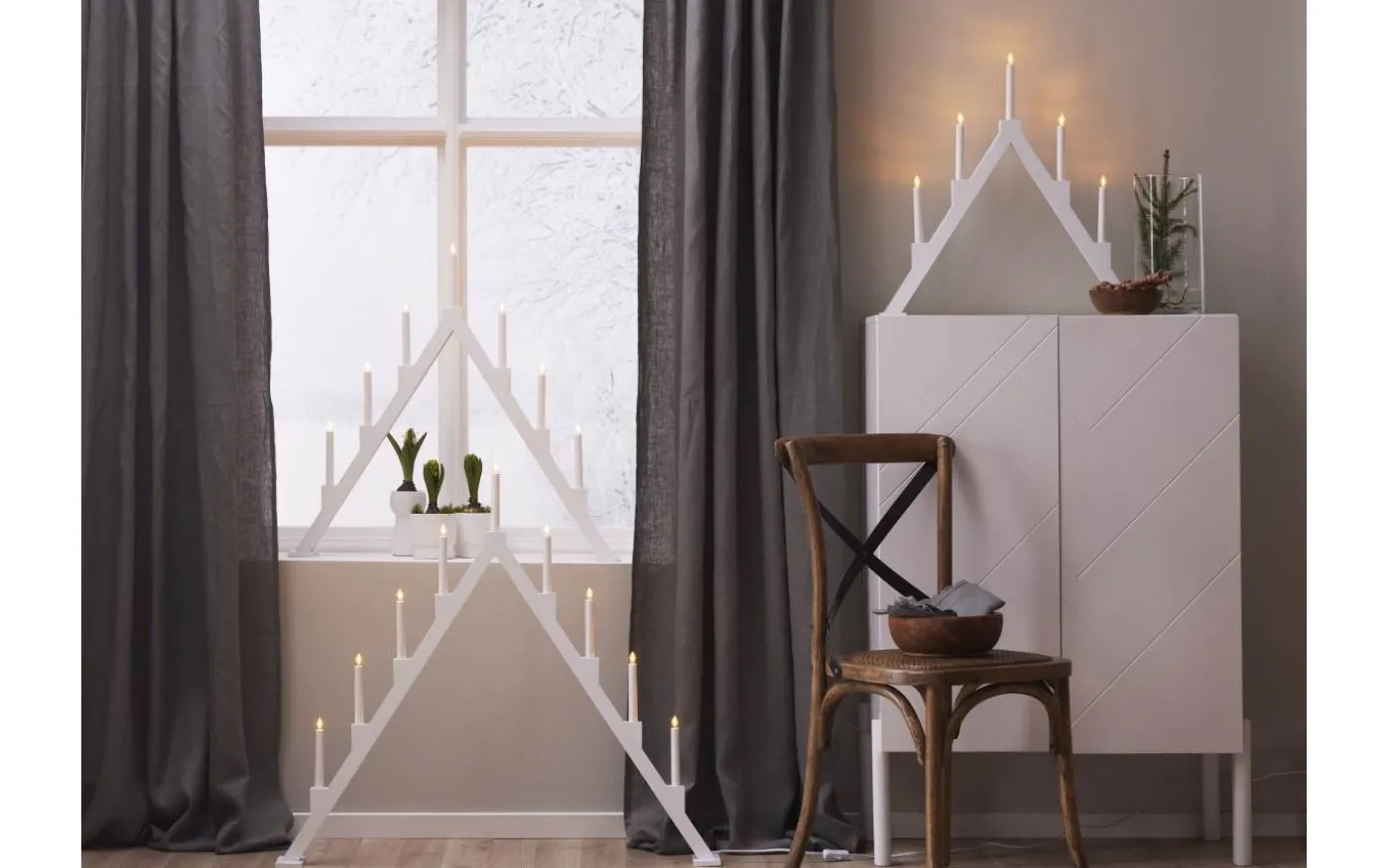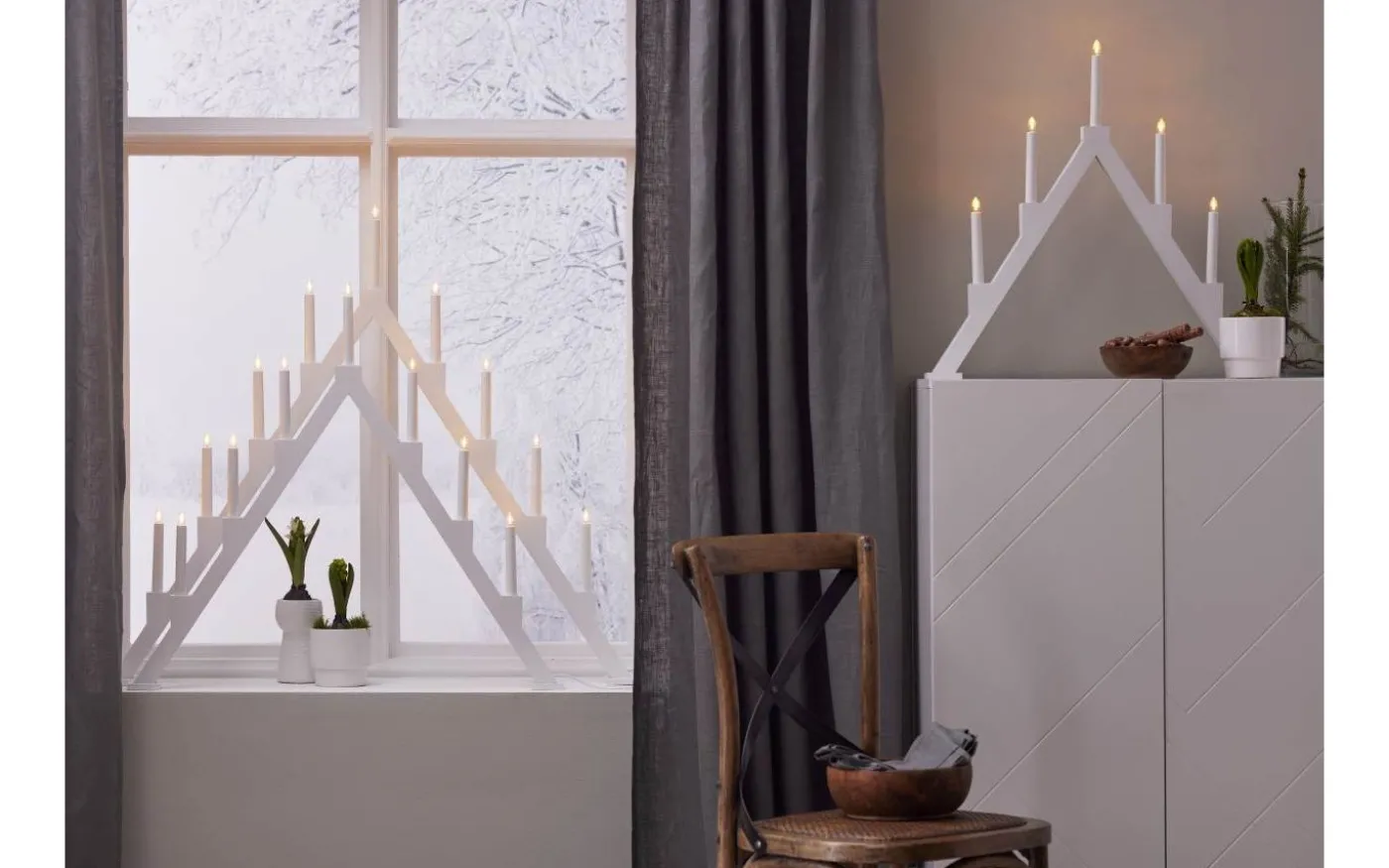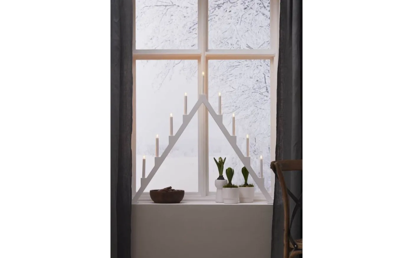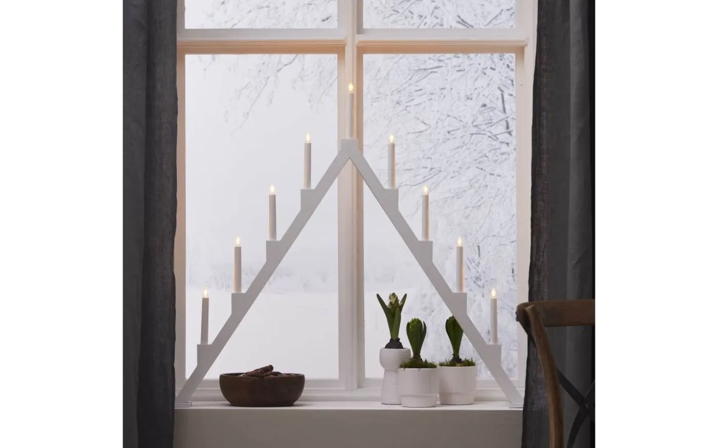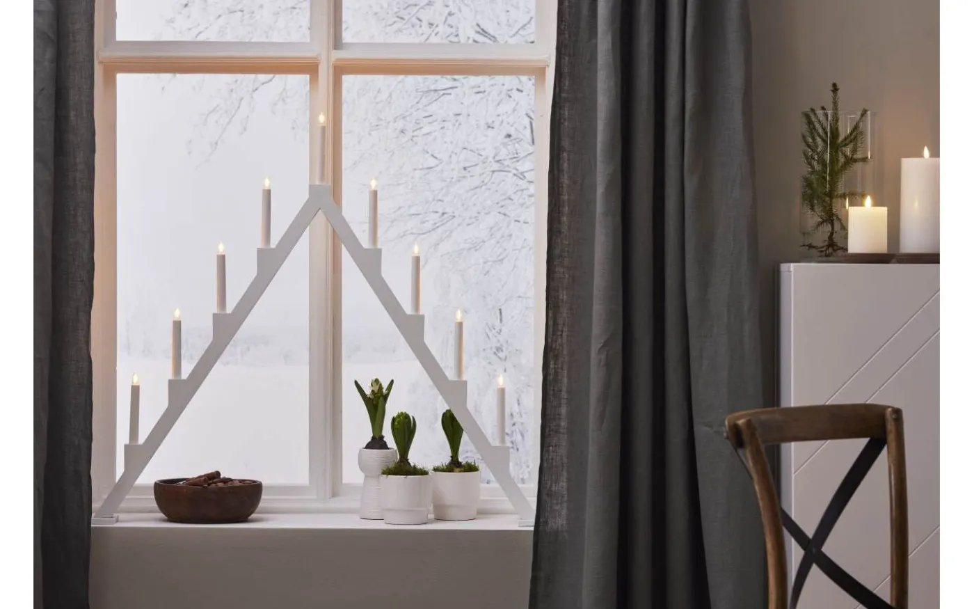 Stilren vit adventsljusstake med klassisk ljusbild. Tillverkad i trä. Finns i tre storlekar. En ljusstake som ej går ur tiden och skapar julstämning i hemmet från år till år. Denna produkt har FSC®-märkning.