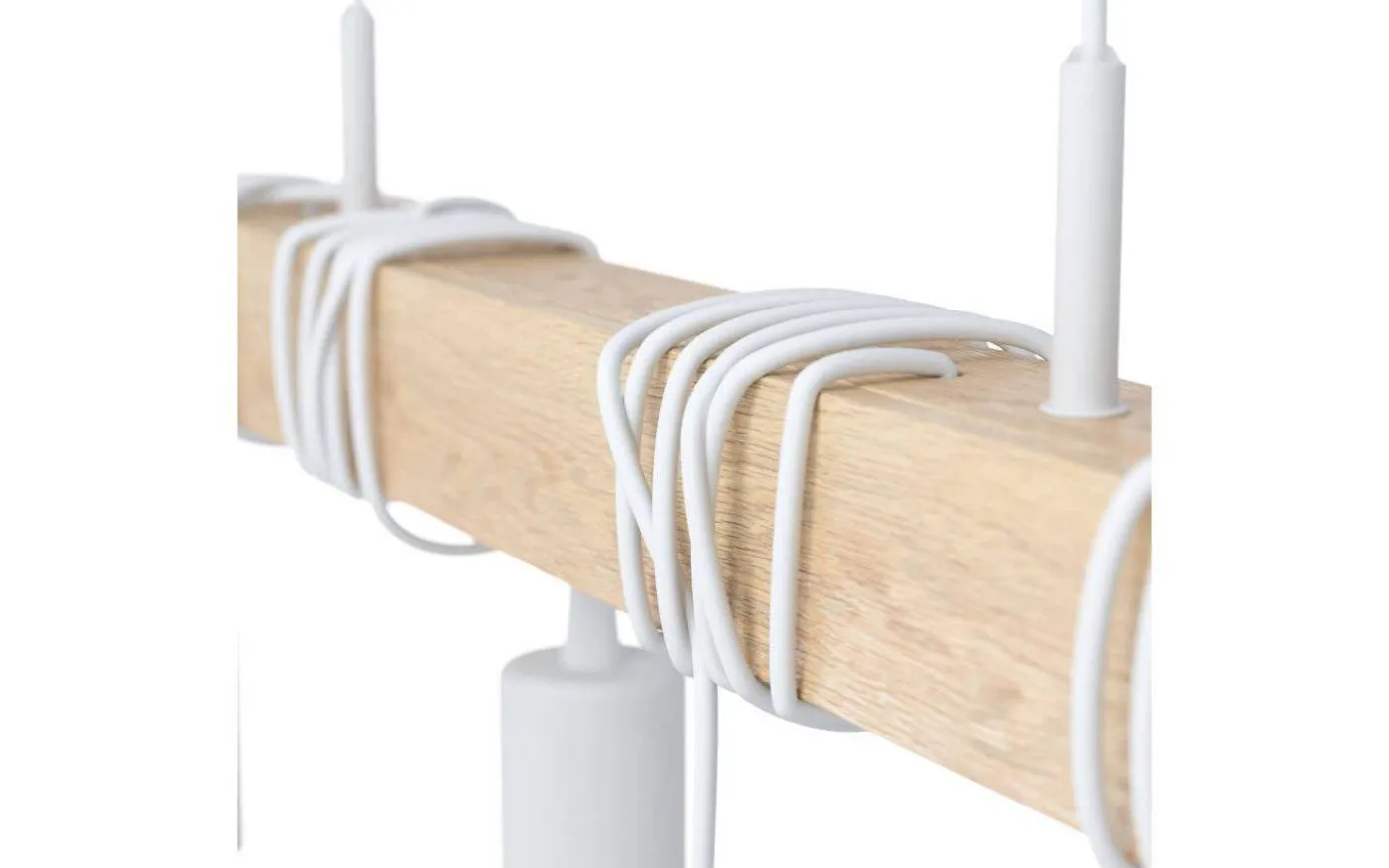 Townshend taklampa från Eglo är en avlång taklampa med stomme i stål kombinerat med ljust trä och fyra invirade lamphållare i vitt. Observera att denna produkt skruvas upp och har en fast anslutning, den går ej att montera på en takkrok.