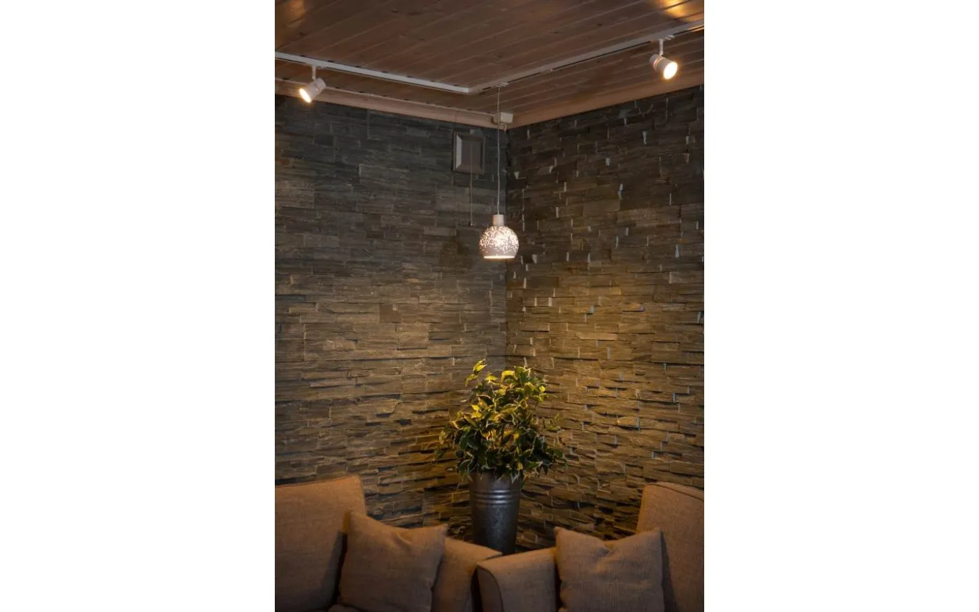 TRACKLINE GALAX en rund metallskärm med liten hålbild som ger ett mjukt sken. Pendel för inkoppling på skena. 40W E27 (ingår ej).