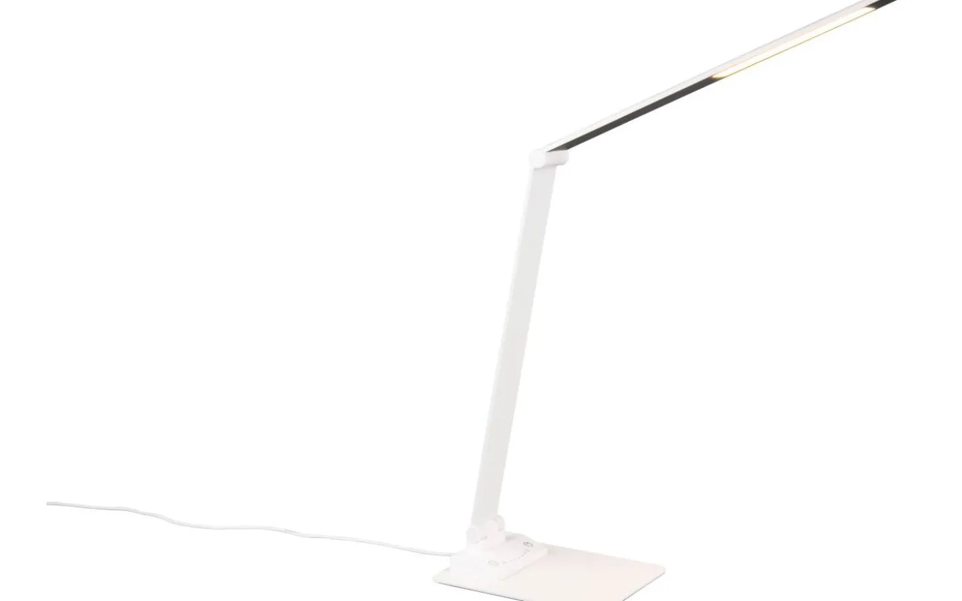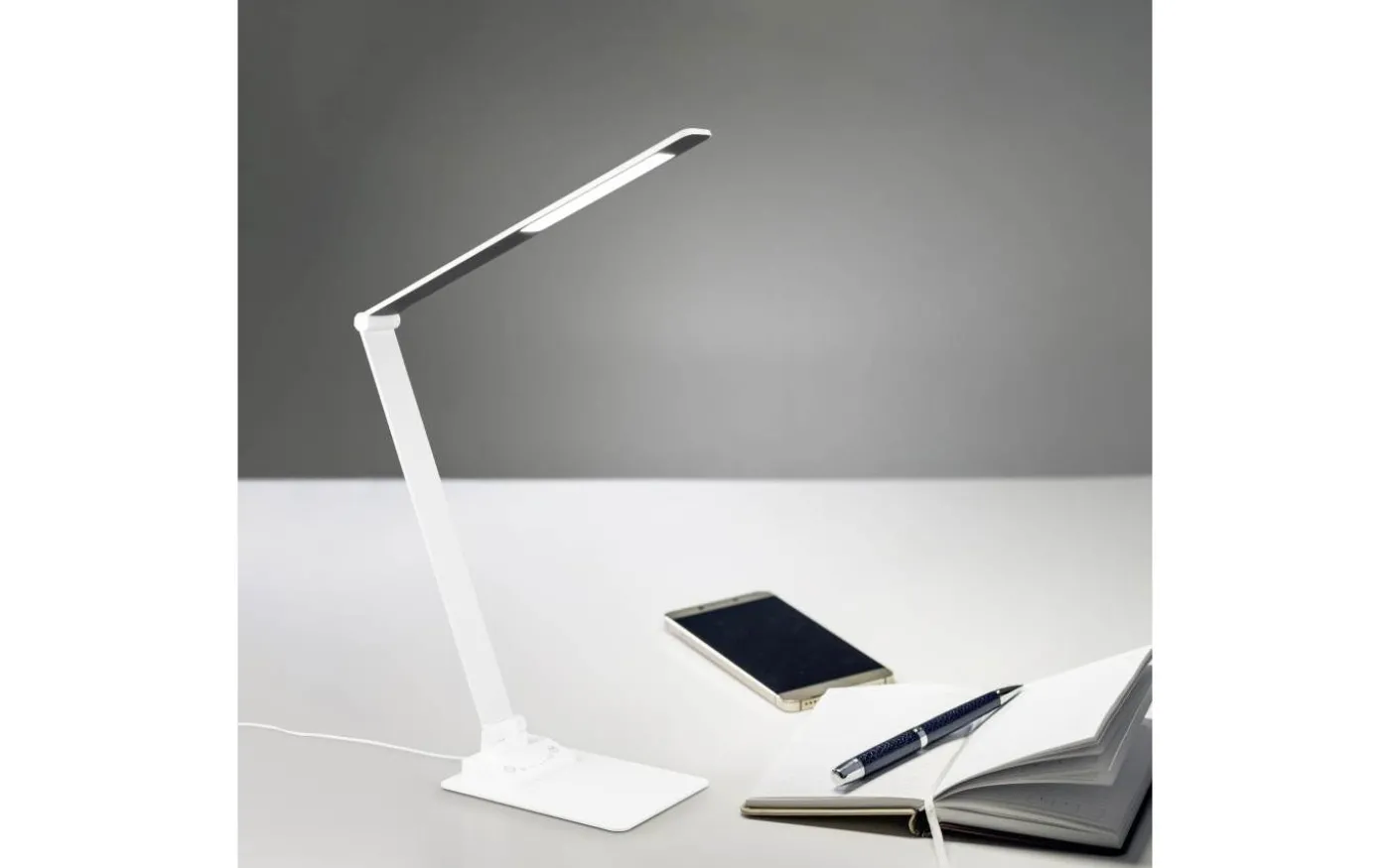 Effektivt arbete beror i hög grad på en idealisk ljusmiljö. Med sin integrerade SWITCH-dimmer erbjuder TRAVIS bordslampa en lösning som är skonsam för ögonen, eftersom ljusstyrkan kan justeras i tre nivåer (100 %, 50 % och 25 %) efter behov. Touchfunktionen på armaturen gör det inte bara möjligt att snabbt tända och släcka ljuset, utan gör det också möjligt att justera ljusfärgen steglöst. De praktiska lederna på armaturen gör att ljuset kan riktas individuellt, vilket gör armaturen till det perfekta valet för alla arbetsområden. Möjligheten att ladda smartphones eller andra enheter via USB- eller USB-C-anslutningen på lampan avrundar det på ett smart sätt. Den enkla designen i mattvitt smälter sömlöst in i alla arbetsytor. Dessutom har armaturerna modern LED-teknik, vilket står för hög ljuskvalitet. LED-ljuskällor kännetecknas av lång livslängd och låg värmeutveckling. Ljuskälla: inklusive 1x SMD, 6,5W · 1x 650lm, 3000+5000+6500K. Extra information: Justerbar ljusfärg, Integrerad dimmer, IP20, Minnesfunktion, På/Av-pekfunktion, Laddning via USB-anslutning, Laddning via USB-C-anslutning