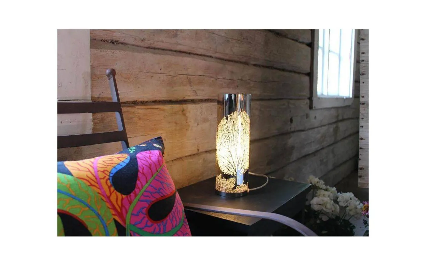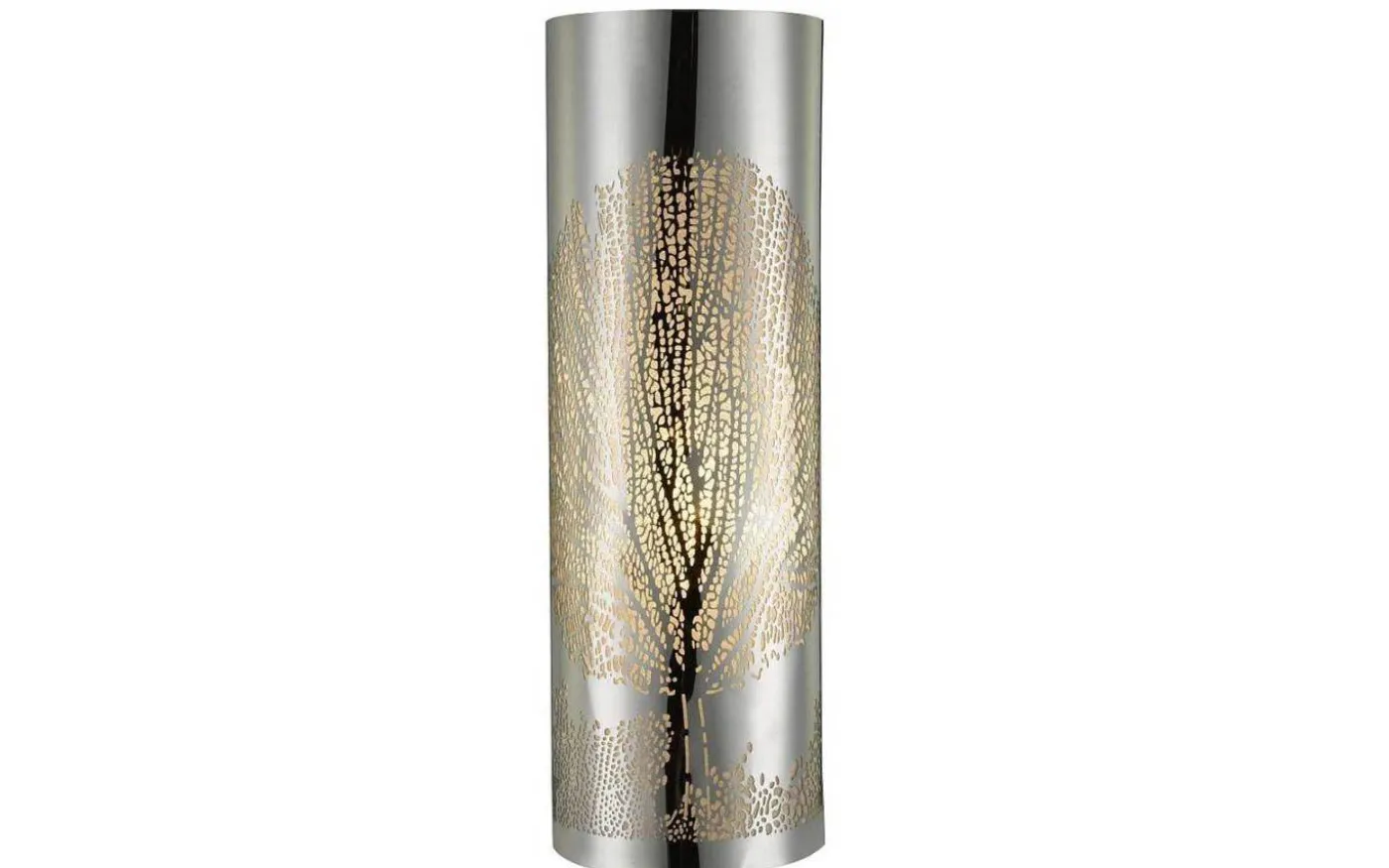 Tree bordslampa från Oriva är en vacker bordslampa i metall med mönster av träd som vacker lyser igenom när lampan är tänd.