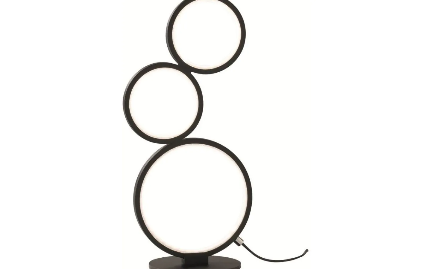 Med sina tre staplade ringar med olika diametrar är bordslampan RONDO en riktig blickfångare. Bordslampan har en integrerad dimmer som styrs via sladdströmbrytaren. Detta gör att du flexibelt kan styra ljusstyrkan på de LED-lampor som är installerade på insidan av varje cirkel. Den 45 cm höga bordslampan är ett riktigt dekorativt element och förhöjer stilfullt alla bostadsutrymmen. Tack vare det mattsvarta färgschemat kan ljuset kombineras med många inredningsstilar. Dessutom har armaturerna modern LED-teknik, vilket står för hög ljuskvalitet. LED-ljuskällor kännetecknas av lång livslängd och låg värmeutveckling. Ljuskälla: inklusive 1x SMD LED, 17W · 1x 1900lm, 3000K. Extra information: Kabelbrytare, Integrerad dimmer, IP20