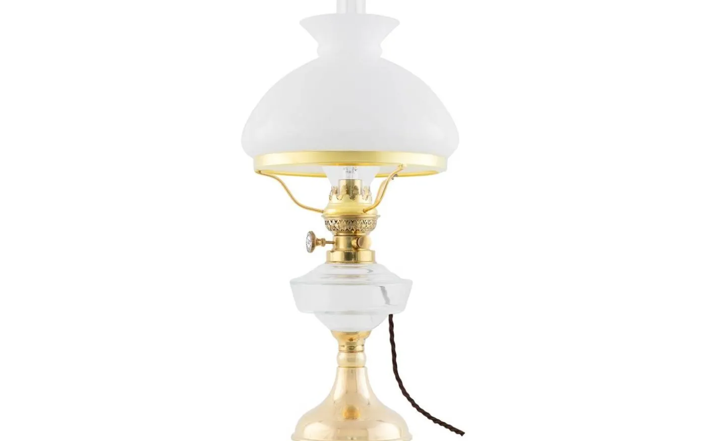 En elmonterad fotogenlampa med oljehus i klarglas som med sin enkla vackert böljande fot, är en riktig klassiker som i sitt originalutförande funnits med i vårt sortiment sedan 1890-talet.