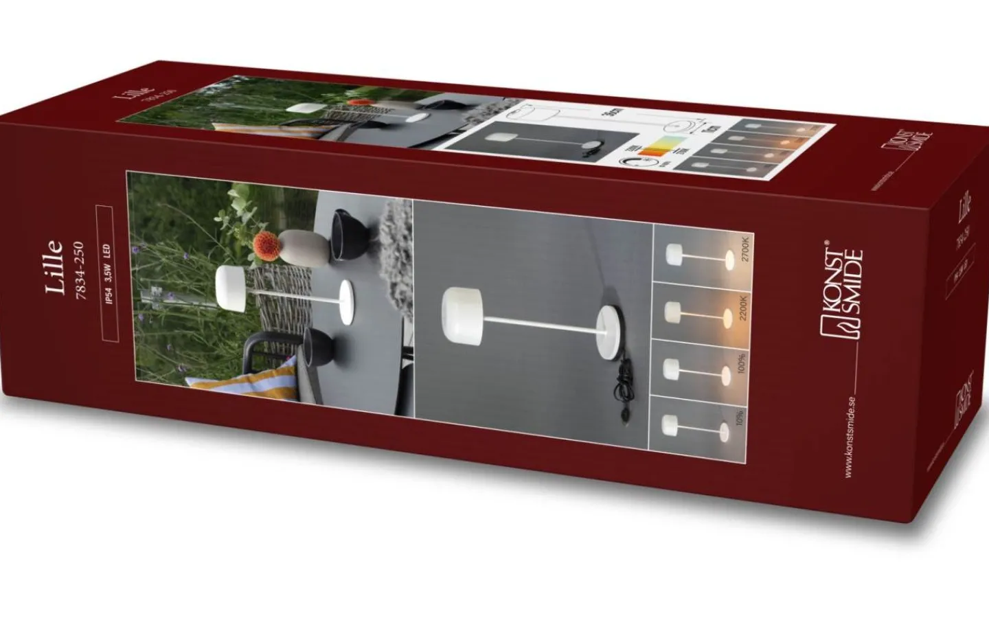Lille uppladdningsbar bordslampa är en enkel och stilren bordslampa från välkända Konstsmide. Bordslampans inbyggda LED-ljus kan du enkelt reglera mellan 10 till 150 lumen. Du kan även reglera färgtemperaturen mellan 2200-2700K.