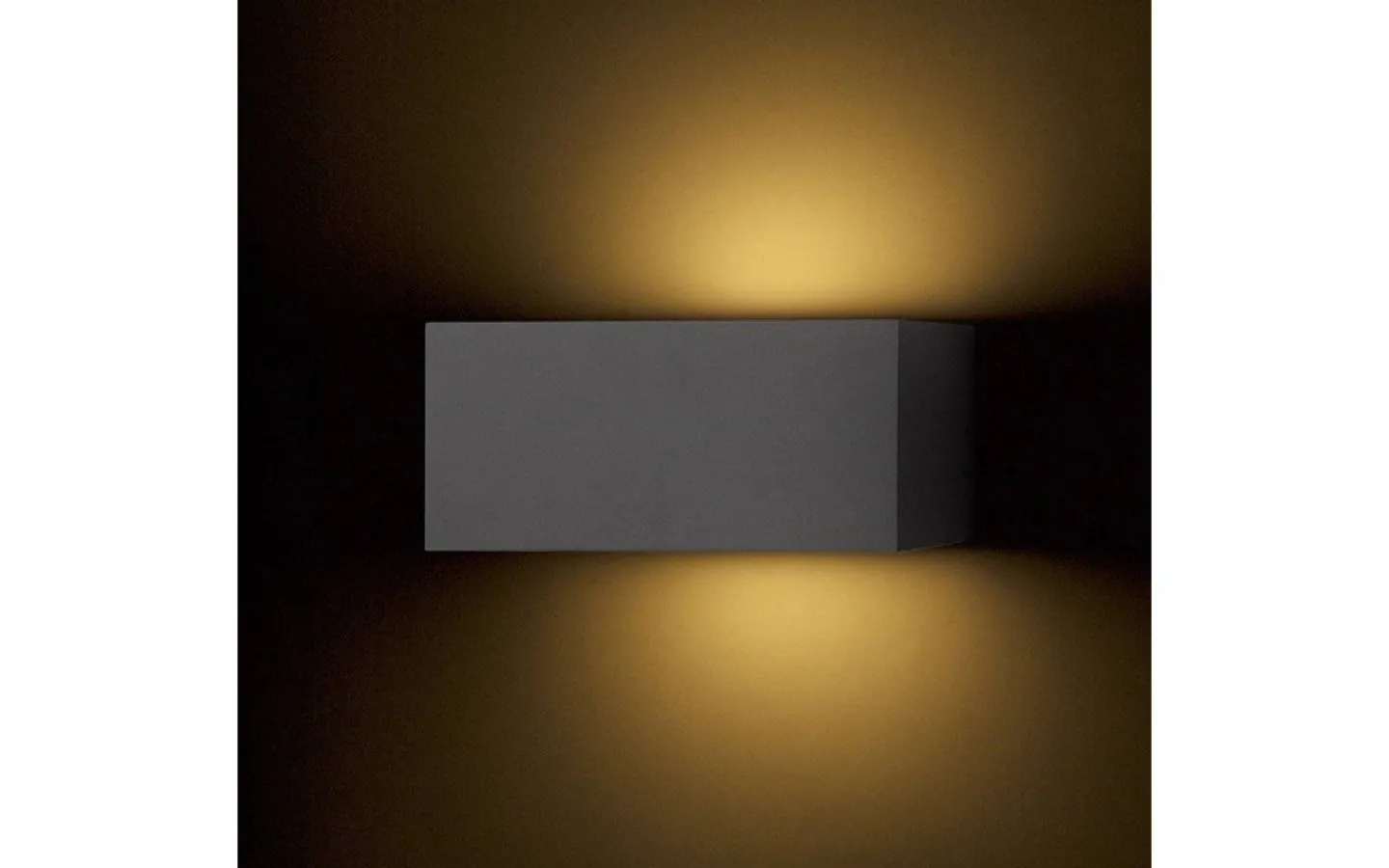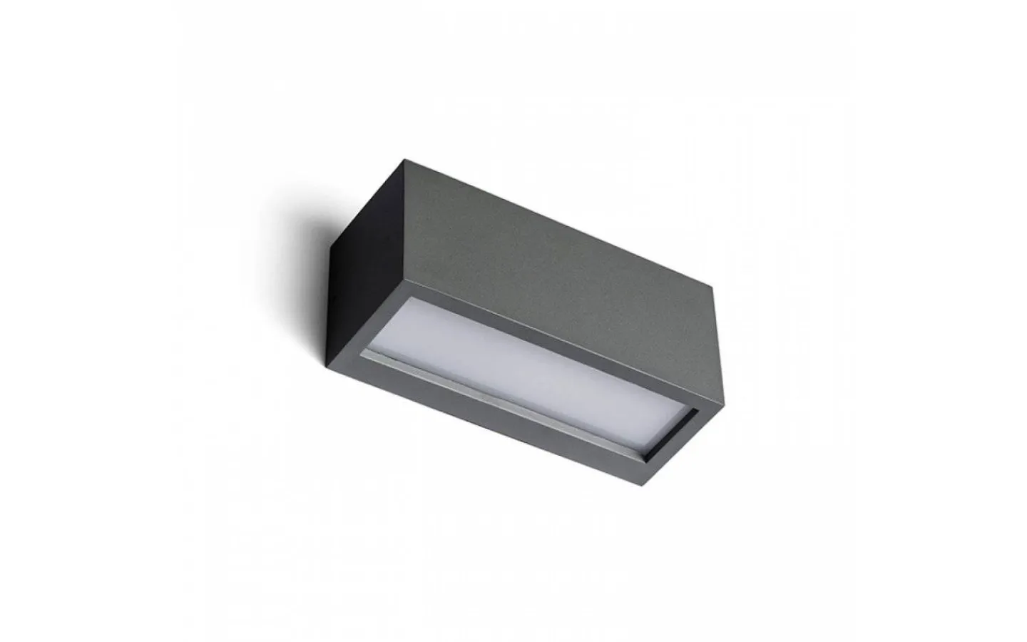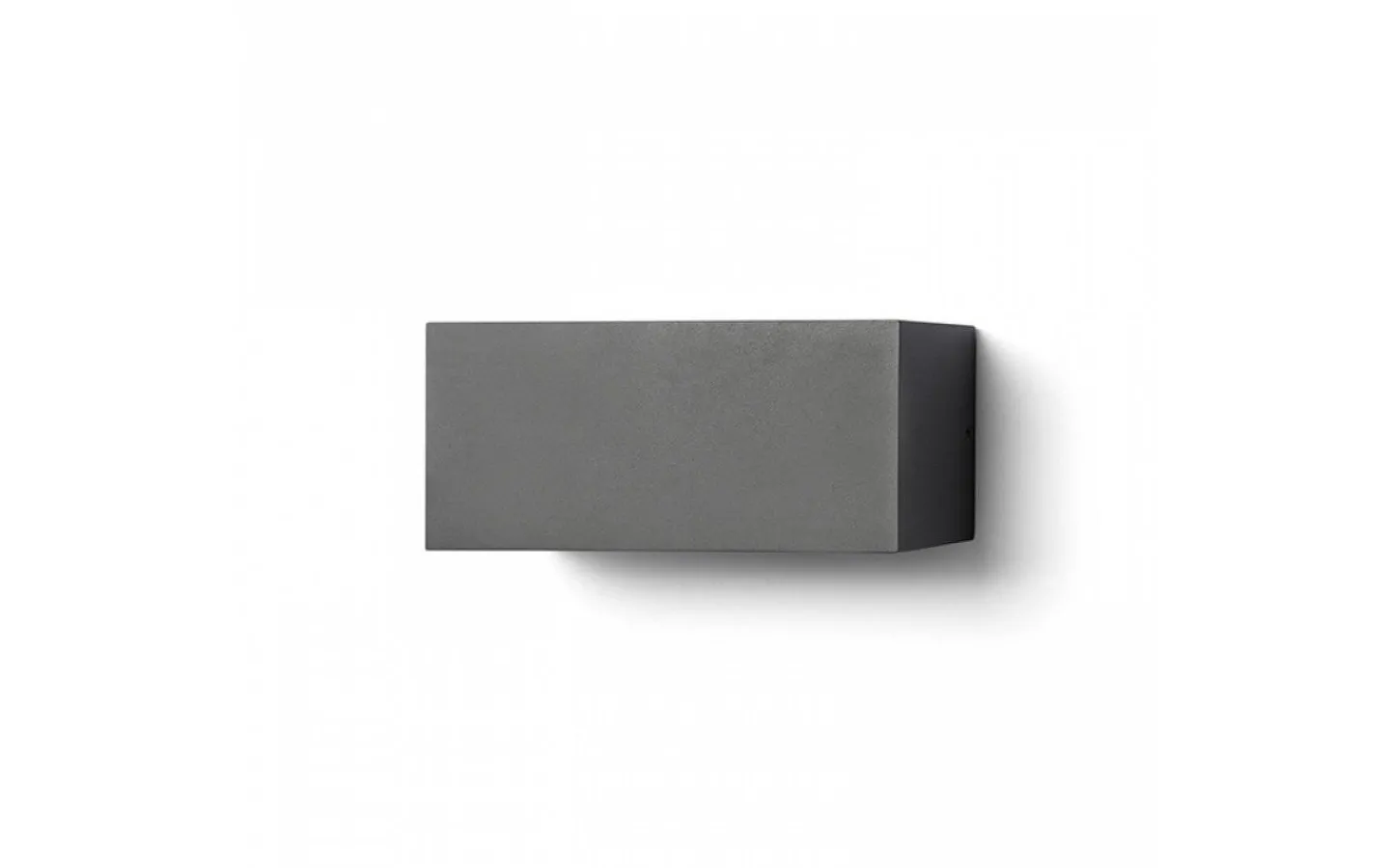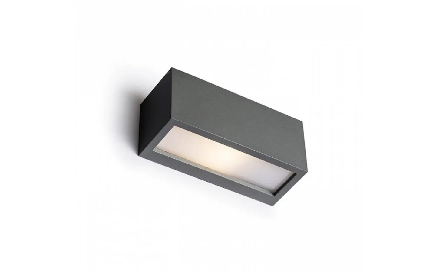 Rektangulär dubbelriktad vägglampa för lågenergiljuskällor med E27-fattning. Lämplig för utomhusbruk.