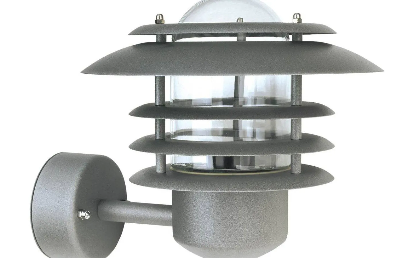 Traditionell utomhus vägglampa med kupa av klart glas som riktar ljuset neråt och ger ett mjukt ljusflöde längs med sidan.