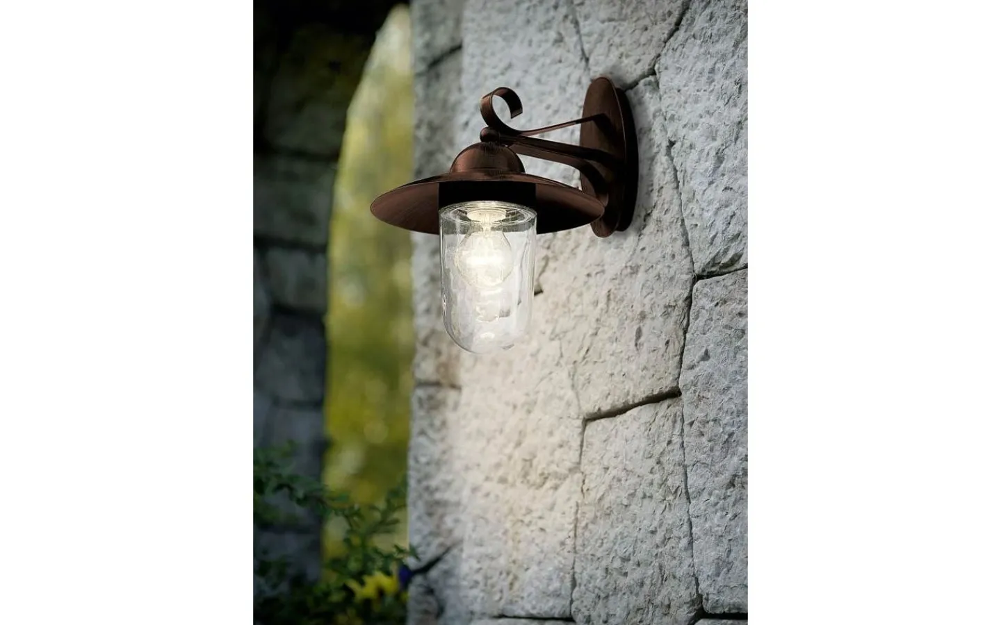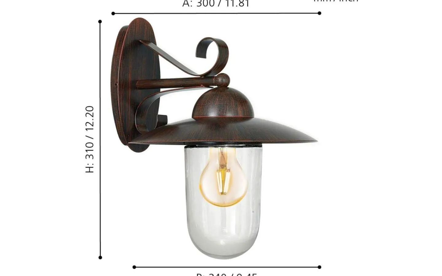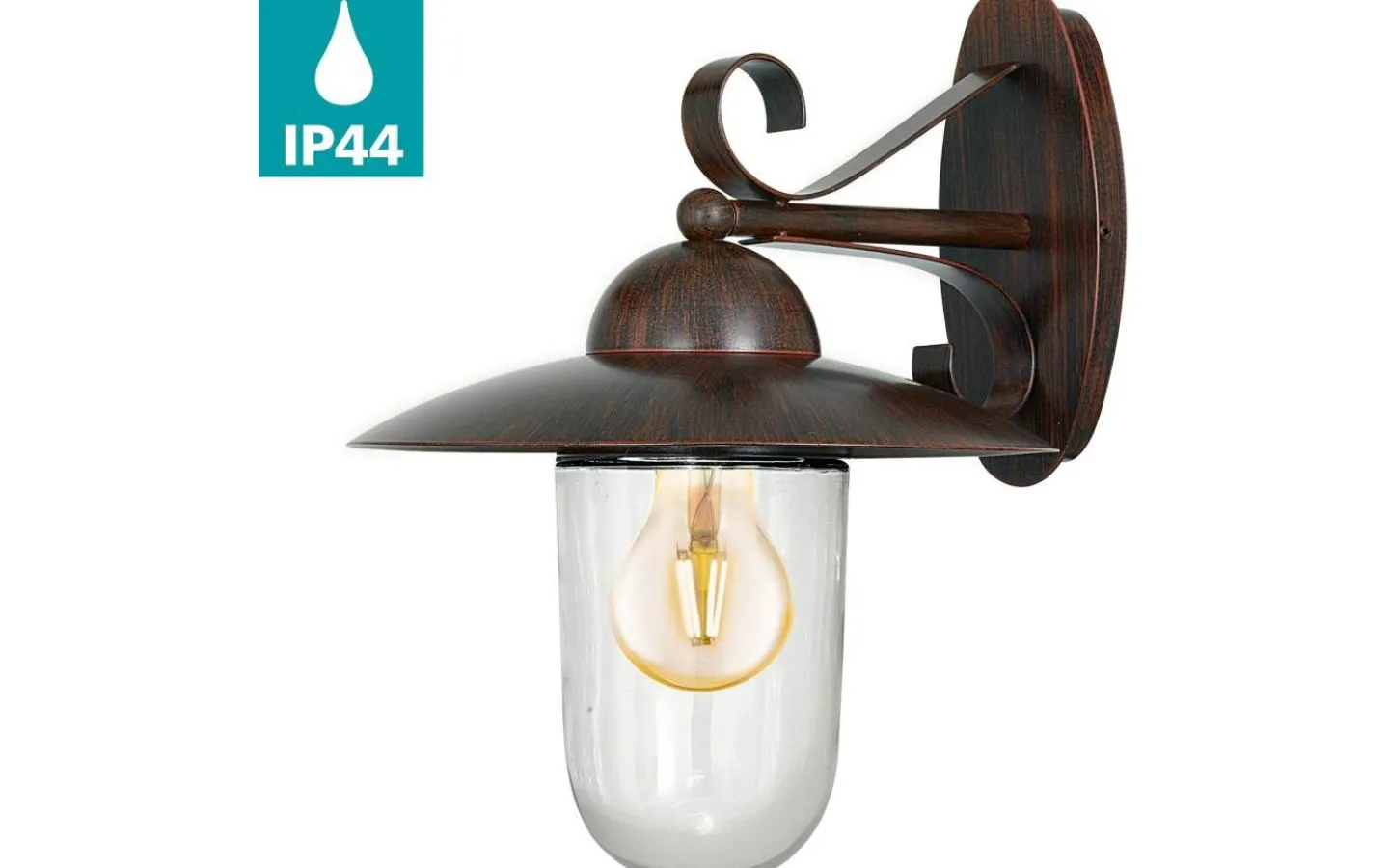 Den yttre vägglampan MILTON i lyktastil har en förzinkad metallstomme i antikbrunt. Den antikbruna lampskärmen har en klar glaskupol, genom vilken glödlampan är synlig. Ytterlampan har IP44-skydd mot sprutvatten och är lämplig för utomhusbruk. Produkten har en klassisk design som smälter in i utomhusutrymmen i en mängd olika stilar och ger belysning som passar miljöer som stadsvillor i traditionell stil eller jugendstil – den perfekta vägglampan för hementrén, terrasserna eller balkongen.