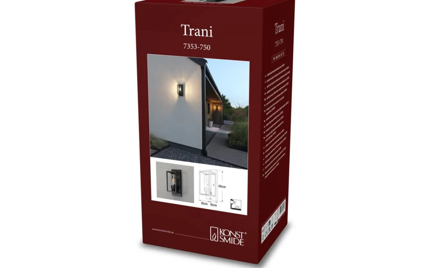 Trani vägglampa från välkända Konstsmide är en modern och stilfull vägglampa. Vägglampan är tillverkad i svartlackerat stål och har en inbyggd ljussensor som gör att lampan tänds automatiskt när det blir mörkt och släcks igen när det blir ljust.