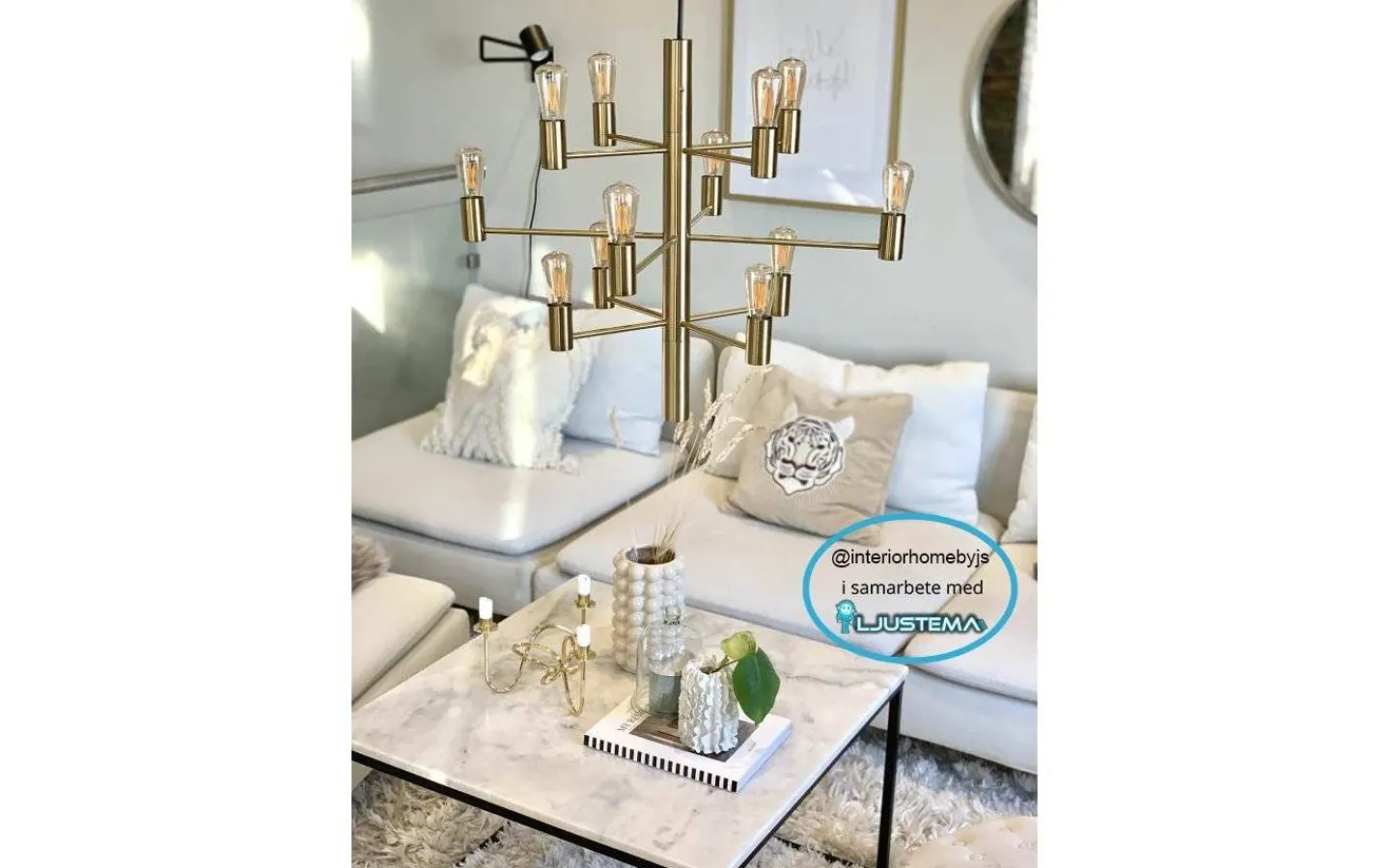 Supersnygg och modern takkrona i lyxig, dansk design från Herstal. Denna modell har tolv armar och är i matt satin mässing färg. Placera den över ditt matsalsbord eller låt den lysa upp ditt vardagsrum och få en riktigt härlig och iögonfallande inredningsdetalj i ditt hem!
