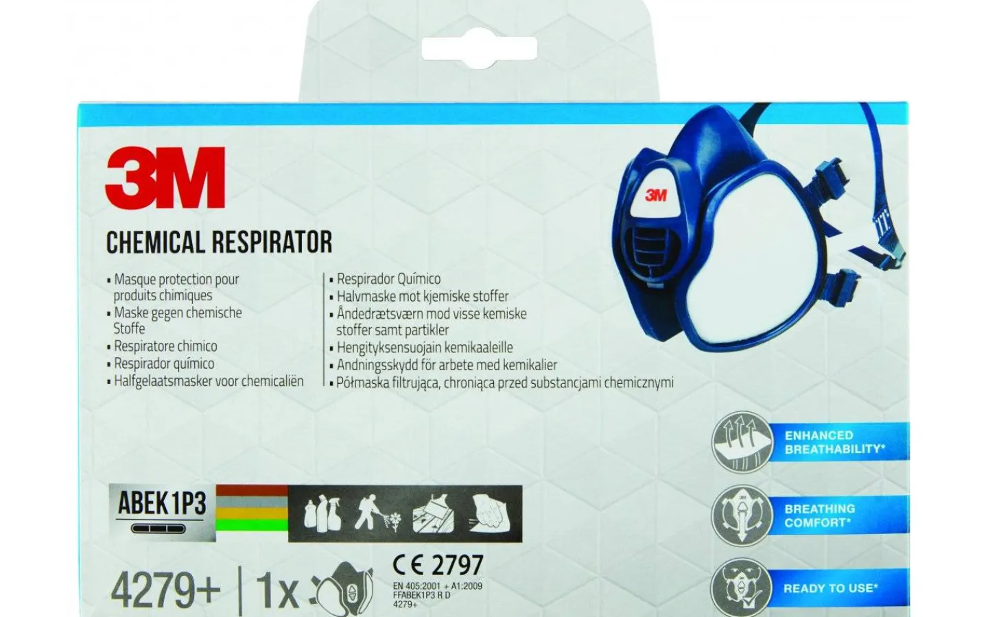 3M 4279+ är en underhållsfri halvmask med integrerade filter för användning i farliga industriella miljöer. En vidareutveckling av 3M:s mest populära underhållsfria återanvändbara halvmask, som är utformad för att underlätta andningen. Skaffa ett effektivt, lättanvänt och färdigmonterat andningsskydd med 3M™ halvmask 4279+. En förbättrad ventil hjälper till att minska andningsmotståndet för behagligare andning. Andningsskyddet har en präglad ansiktstätning som är mjuk, allergivänlig och silikonfri, och ger FFABEK1P3 R D-skydd mot en rad olika skadliga organiska gaser, ångor och partiklar. Den lätta, välbalanserade designen har en centralt placerad utandningsventil som hjälper till att reducera uppbyggnad av värme och fukt, så att du kan jobba bekvämt även under varma och fuktiga förhållanden.