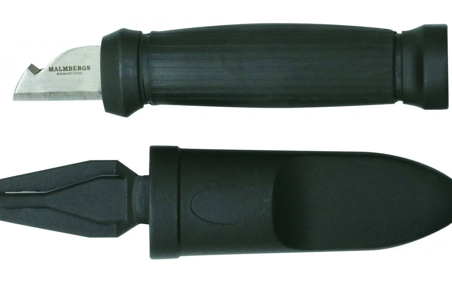 Liten och smidig elkniv med specialslipning för kabelskalning. Sporren är dubbelslipad för både höger- och vänsterhänta. Greppvänligt handtag av gummi och blad av rostfritt stål. Helgjuten slida för bältesfäste eller knivknapp.