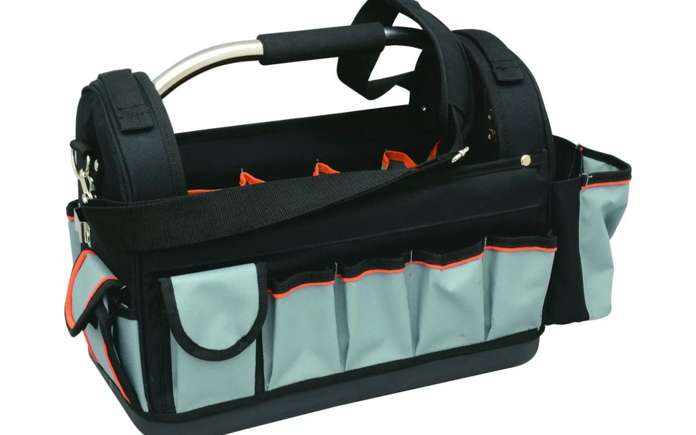 Verktygsväska i kraftig polyester med plastbotten. Med 10 innerfack samt låda för verktyg. 8 ytterfickor, 3 sidofack, 1 sidoficka för pennor m.m. Vadderat bärhandtag och axelrem.