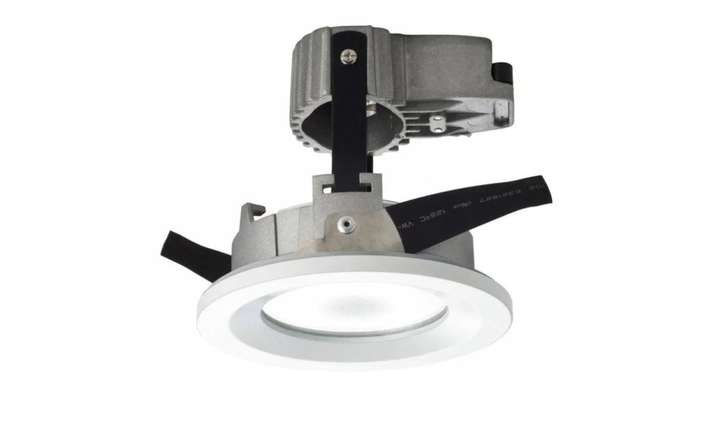 Infälld lampa för våtutrymmen med en täckskiva av delvis satinerat glas. Transformator tillkommer.