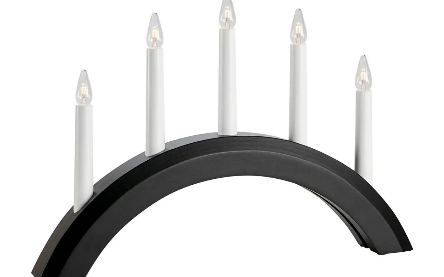 Svart bågformad adventsljusstake med fem ljuskällor. Ljusstaken har en bredd på 40 cm och passar i alla hem. Tekniskt: Ljusstaken kräver fem glödlampor med E10-sockel om max 3W, ingår. 2m lång sladd med strömbrytare.