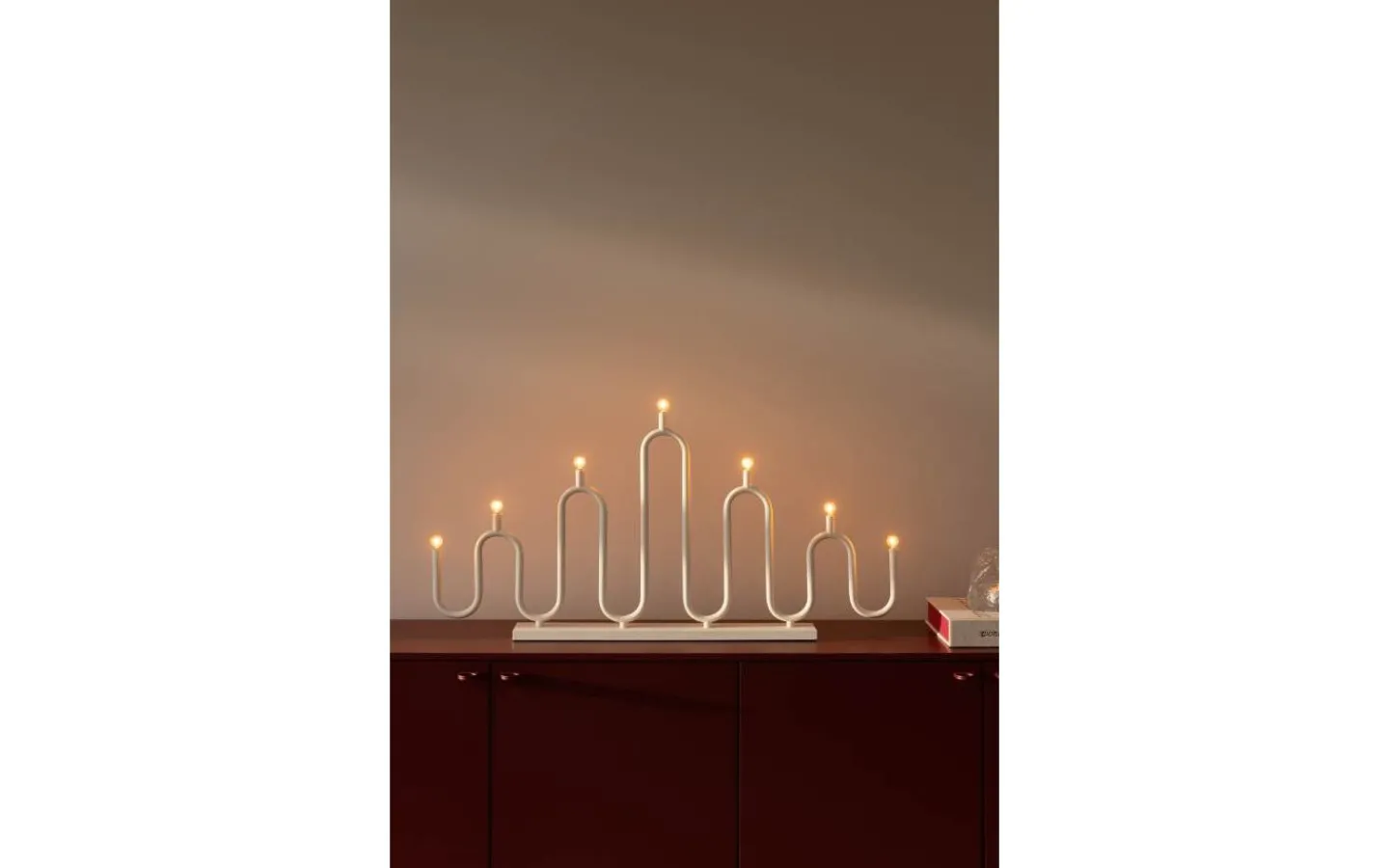 Noel från Globen Lighting är en adventsljusstake med nytt spännande formspråk. Den svängda designen, där metallrören böjs för hand i olika höjder, ger ljusstaken en unik form samtidigt som den behåller det traditionella utseendet av en adventsljusstake.