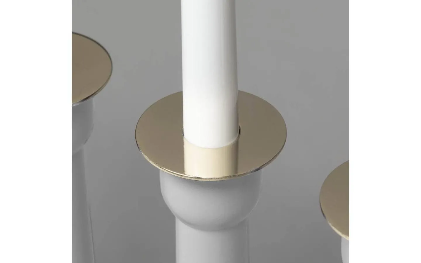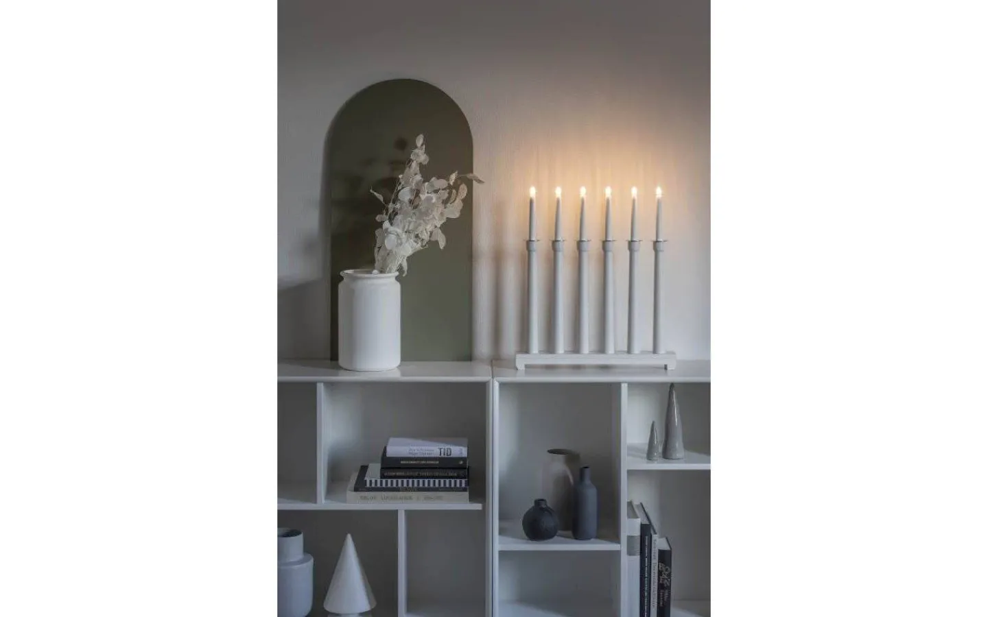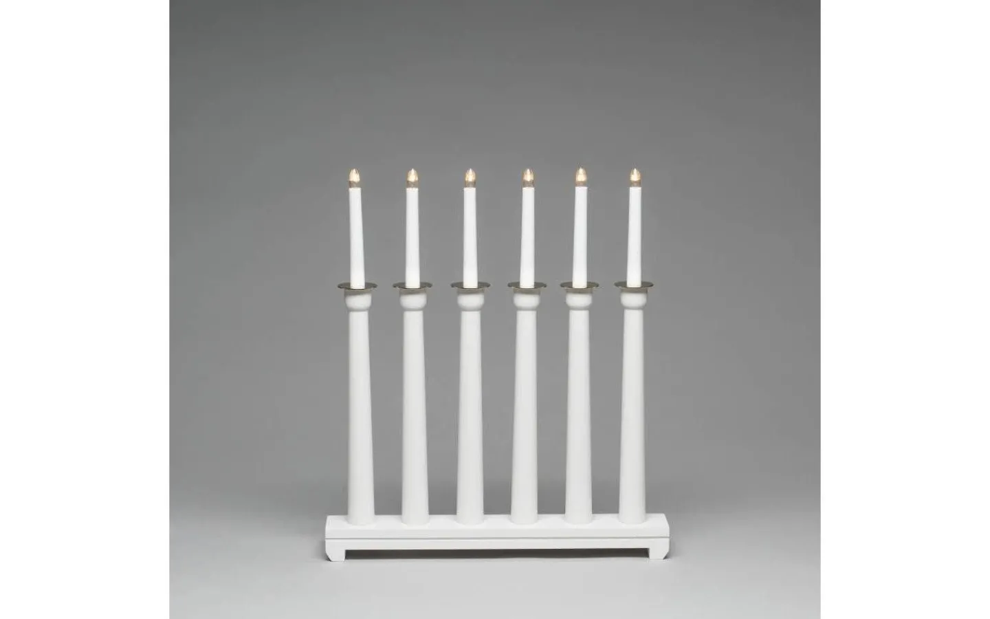 Eleganta elljusstaken Lovis, från välkända Konstsmide, är en 6-armad adventsljusstake i trä med en vacker vit finish och detaljer i mässing.
