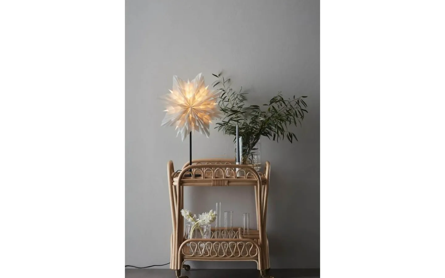 Den grå pappstjärnan släpper genom ett fint ljusflöde och Neela levereras med 2 meter kabel med strömbrytare och stickkontakt för vägguttag.
