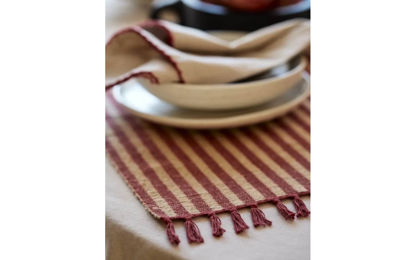 Adam från Svanefors är en randig löpare av 50% bomull och 50% jute med kort frans längst kortsidorna. Storlek 33x120cm är exklusive frans.